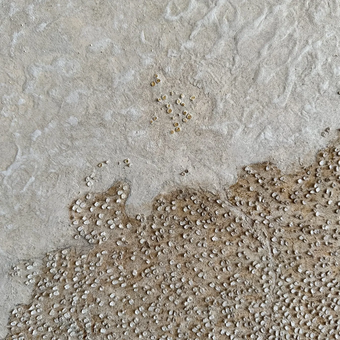 Definita dalla suggestiva rappresentazione del confine terra-mare, quest’opera rivela un antico paesaggio segnato dal tempo. La tela mostra le tracce della linea di costa scomparsa in una tavolozza di bianco, sabbia e ocra rossa. Realizzata con un impasto sabbioso modellato a mano o con una spatola, riflette il profondo legame tra umanità e natura. Quest’opera d’arte svela una prospettiva unica di un paesaggio scomparso e senza tempo. Ogni dipinto è unico.