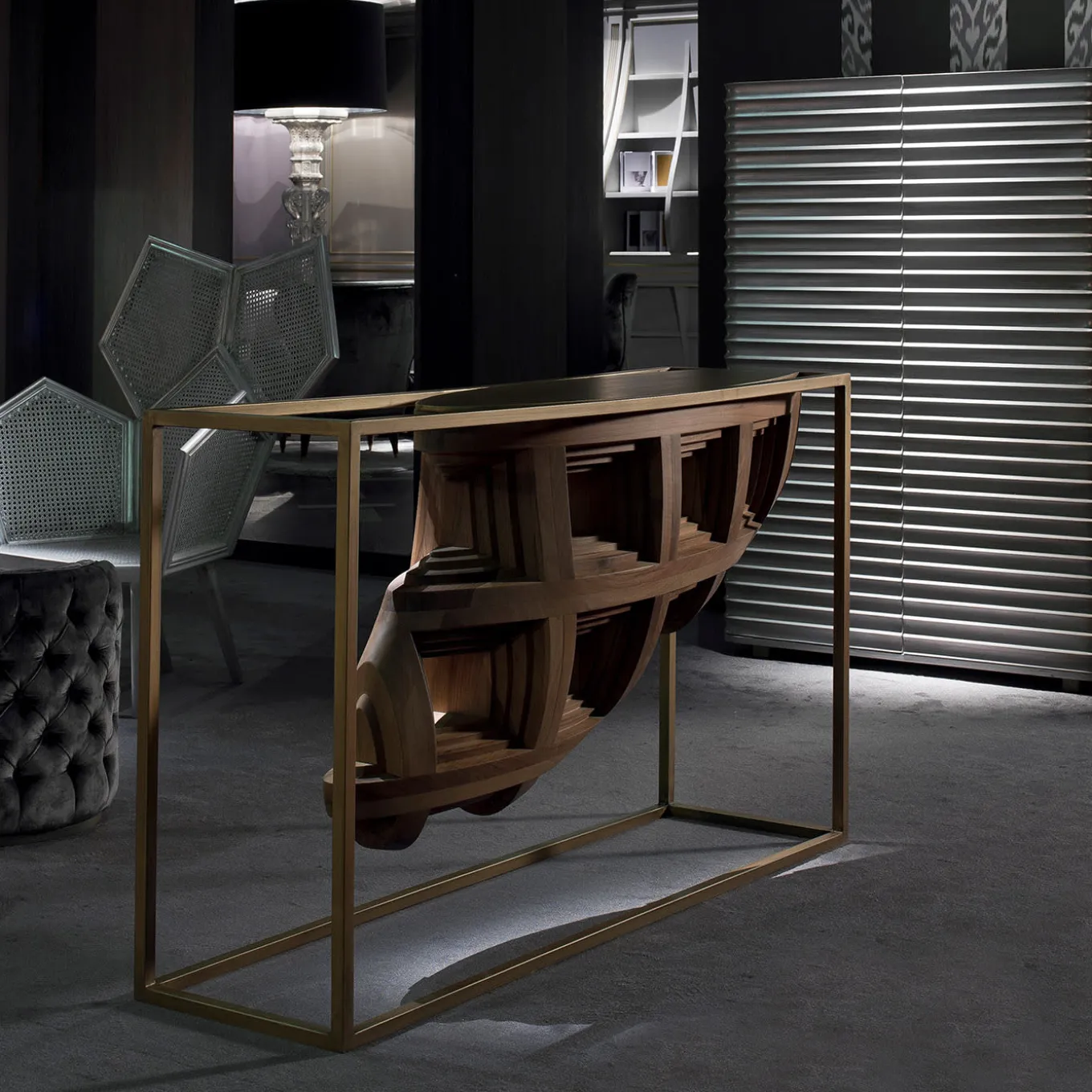 Scoprite il fascino di Lui 5A di Philippe Bestenheider, una moderna interpretazione di una classica sedia in legno di Fratelli Boffi. Ispirata al design dei primi del ‘900, questa sedia abbraccia le sedute in doppia paglia di Vienna con un tocco futuristico. La forma pentagonale è al centro della scena, creando un’armoniosa fusione di tradizione ed estetica contemporanea. Rivestita in lussuosa foglia di piombo, Lui 5A è una testimonianza di fedele artigianalità e raffinatezza senza tempo.