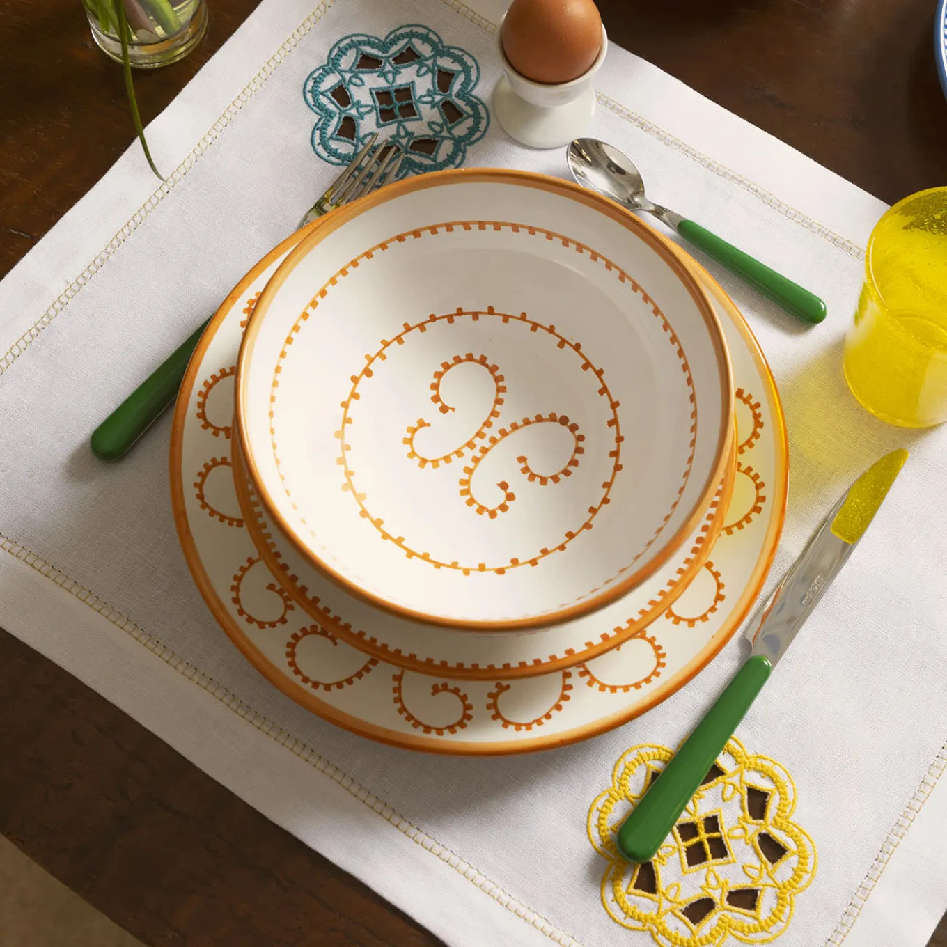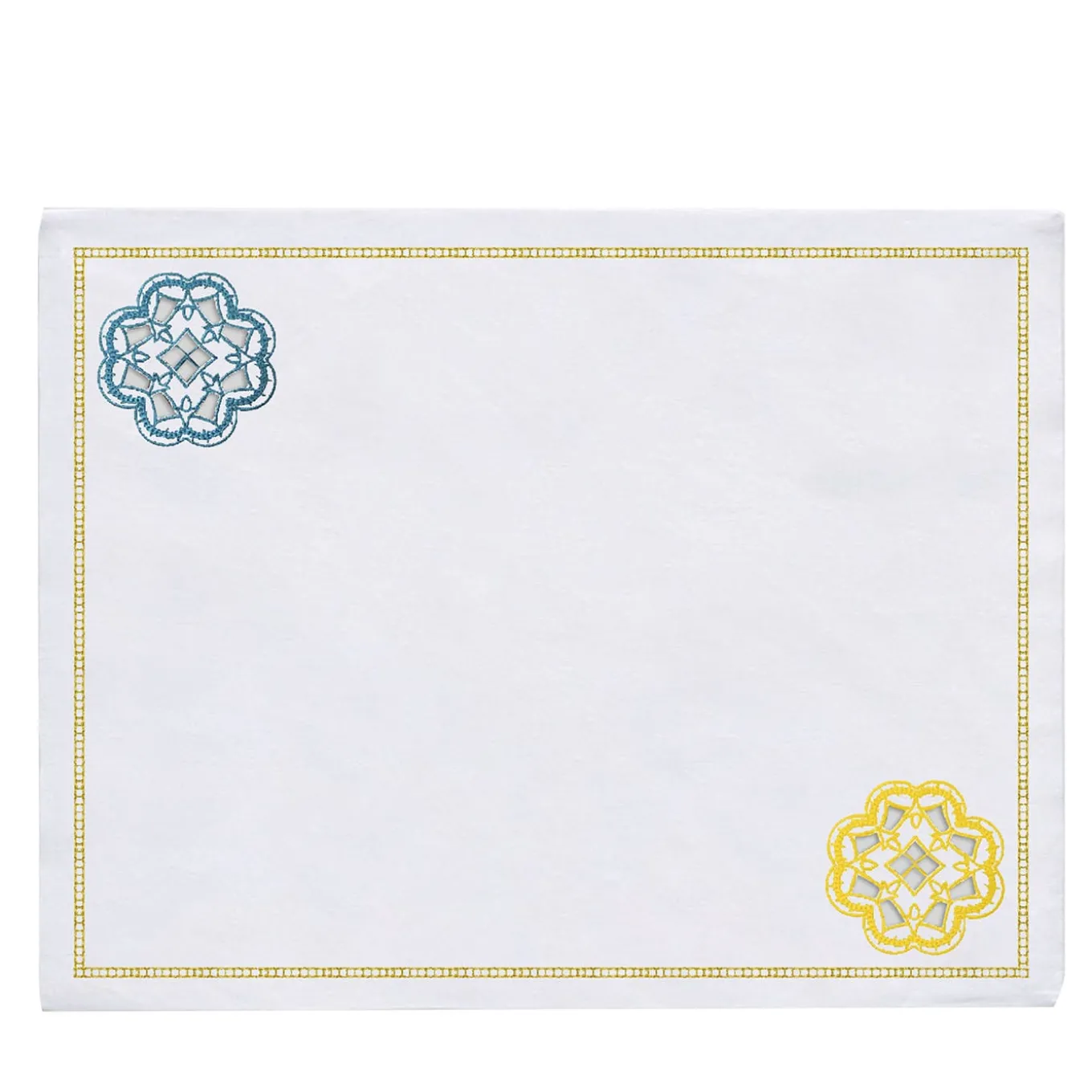Perfetto per gustare il pranzo o la colazione con un pizzico di eleganza, questo set di due tovagliette in lino è un gioiello di maestria artigianale. I raffinati ricami in cotone Mako traggono ispirazione dalle installazioni luminose mozzafiato che affollano le feste cittadine pugliesi, un’immagine festosa che viene in mente soffermandosi sulle forme intriganti e le tonalità vivaci dei ricami.