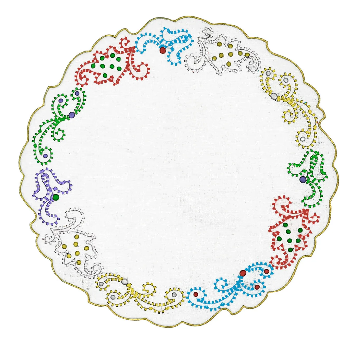 Evocando lo spettacolo delle installazioni luminose colorate delle feste cittadine pugliesi, una corona di ricami manuali minuziosi e vibranti conferisce a questo set di due tovagliette da tavola in lino un fascino giocoso. I profili dinamici delle luci hanno ispirato anche i bordi sagomati delle tovagliette, per un ritmo coerente e distintivo. Certificato Masters-of-linen, il set utilizza solo il pregiato cotone Mako per i suoi ricami.