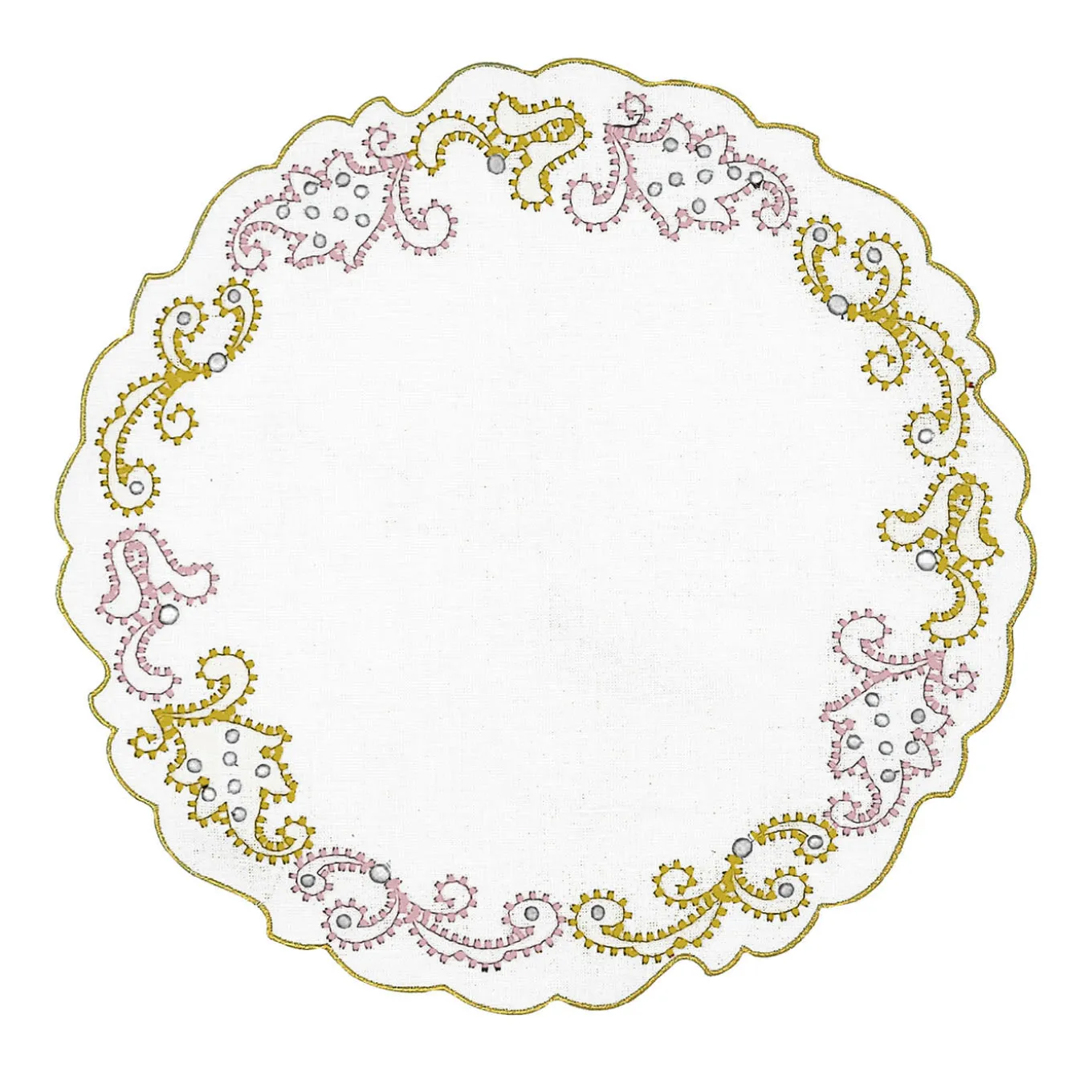 Vetrina della maestria del ricamo, questo set di due tovagliette da tavola in lino evoca lo spettacolo di una passeggiata sotto le installazioni luminose colorate che affollano le feste cittadine pugliesi. Sia i bordi sagomati che i ricami in cotone Mako sfoggiano un ritmo intrigante che si aggiunge all’audace combinazione cromatica di oro e rosa di questi ultimi. Molteplici varianti di colore sono disponibili nel catalogo Artemest.
