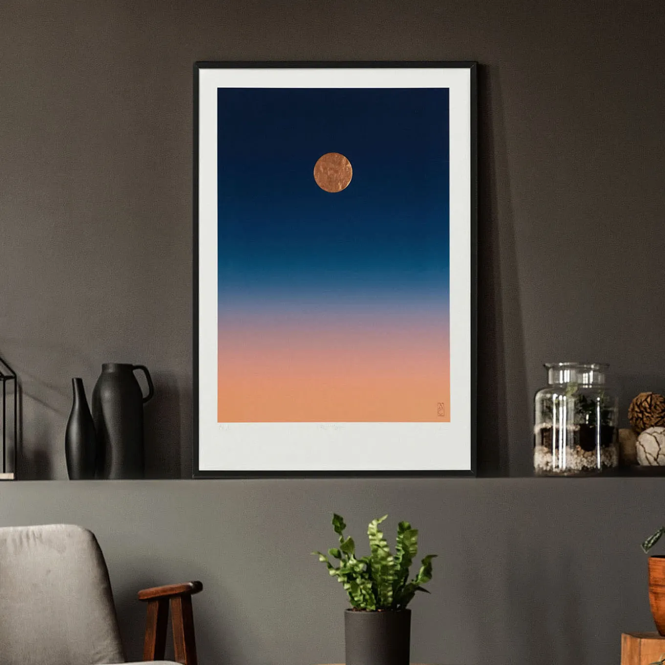 Questa romantica stampa tipo glicée su cotone 100% si ispira al celebre verso “Che fai tu, luna, in ciel? dimmi, che fai, silenziosa luna?” che il poeta Giacomo Leopardi dedicò alla luna. La luna piena – realizzata con un piatto d’argento – si staglia su uno sfondo onirico in cui il blu profondo sfuma progressivamente in arancione albicocca, evocando un tramonto. Si prega di chiedere al Concierge il prezzo della cornice (non inclusa) e della variante di 50×70 cm.