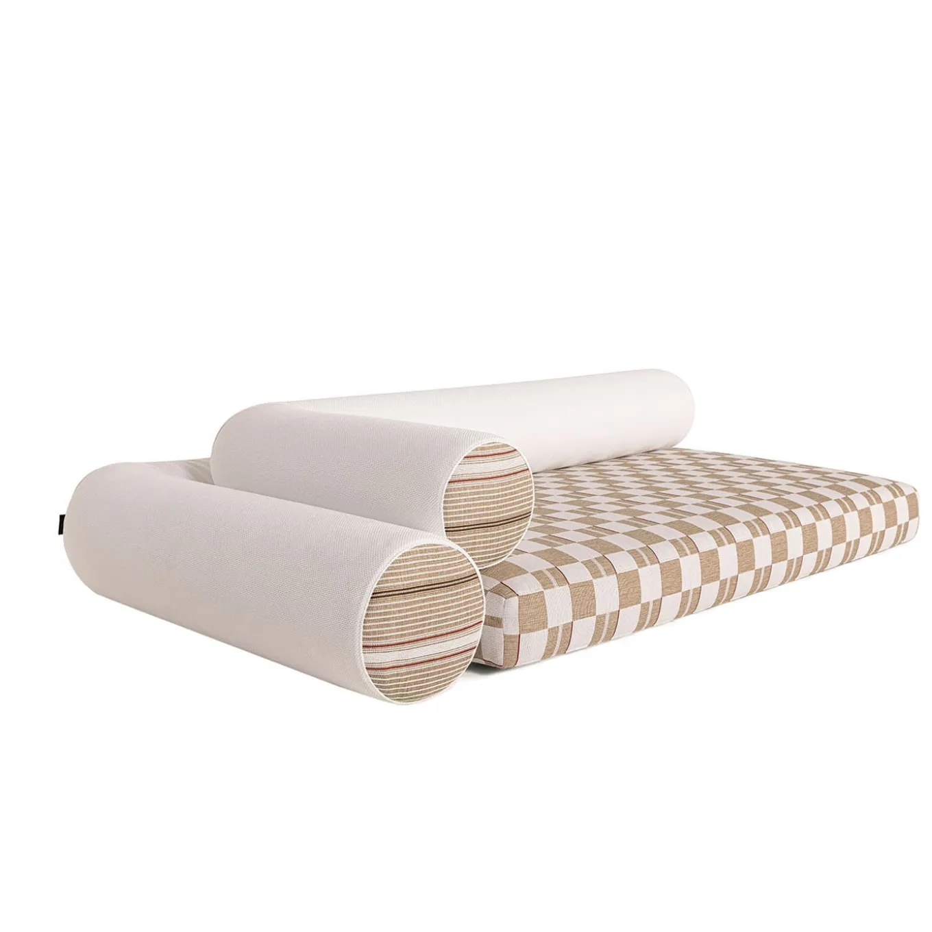 Majlis prende il nome da uno spazio tradizionale in uso nei Paesi arabi, dedicato all’ospitalità e alla convivialità. È un sistema di sedute modulari per esterni dalle dimensioni generose, dalle forme arrotondate e dall’eccezionale comfort di seduta. È caratterizzato da un ampio cuscino di seduta abbracciato da due rotoli che fungono da schienale, realizzati in diverse dimensioni e densità. Un tessuto traspirante e idrorepellente riveste l’inserto. Il prezzo comprende i cuscini decorativi, come mostrato nell’immagine, e la copertura protettiva per ogni modulo.