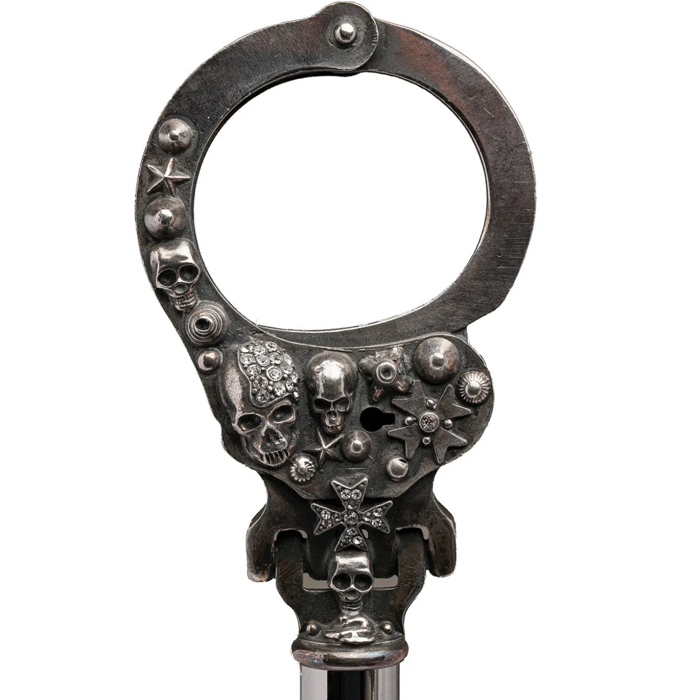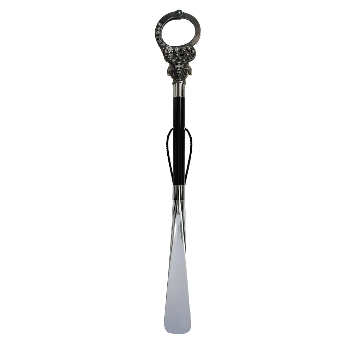 Un’irresistibile attrazione per il macabro definisce il carattere eccentrico di questo calzascarpe artigianale, un accessorio esclusivo fornito con una custodia di marca. L’aspetto tetro del fusto in faggio laccato in nero lucido si armonizza con la finitura argentata del manico in metallo, la cui decorazione combina una manetta ornata di teschi e strass. Uno dei due anelli in ottone argentato mantiene in posizione la paletta in ABS argentato, mentre un passante integrato permette di appenderla in modo pratico.