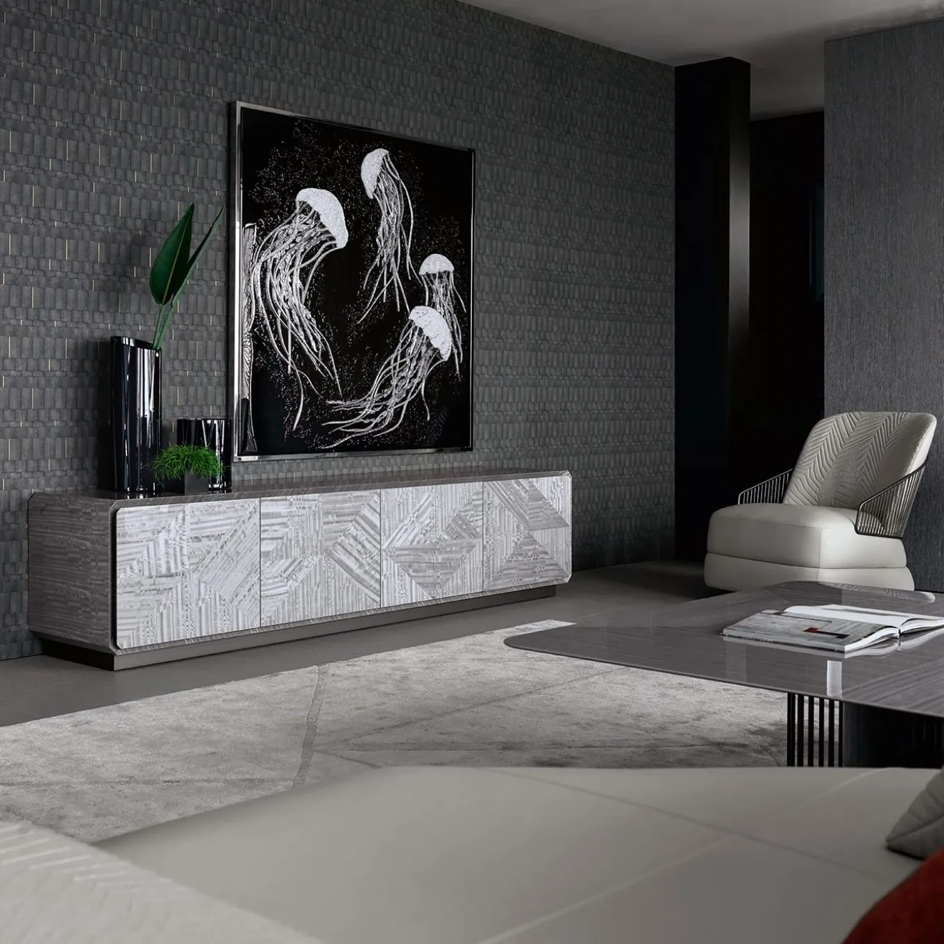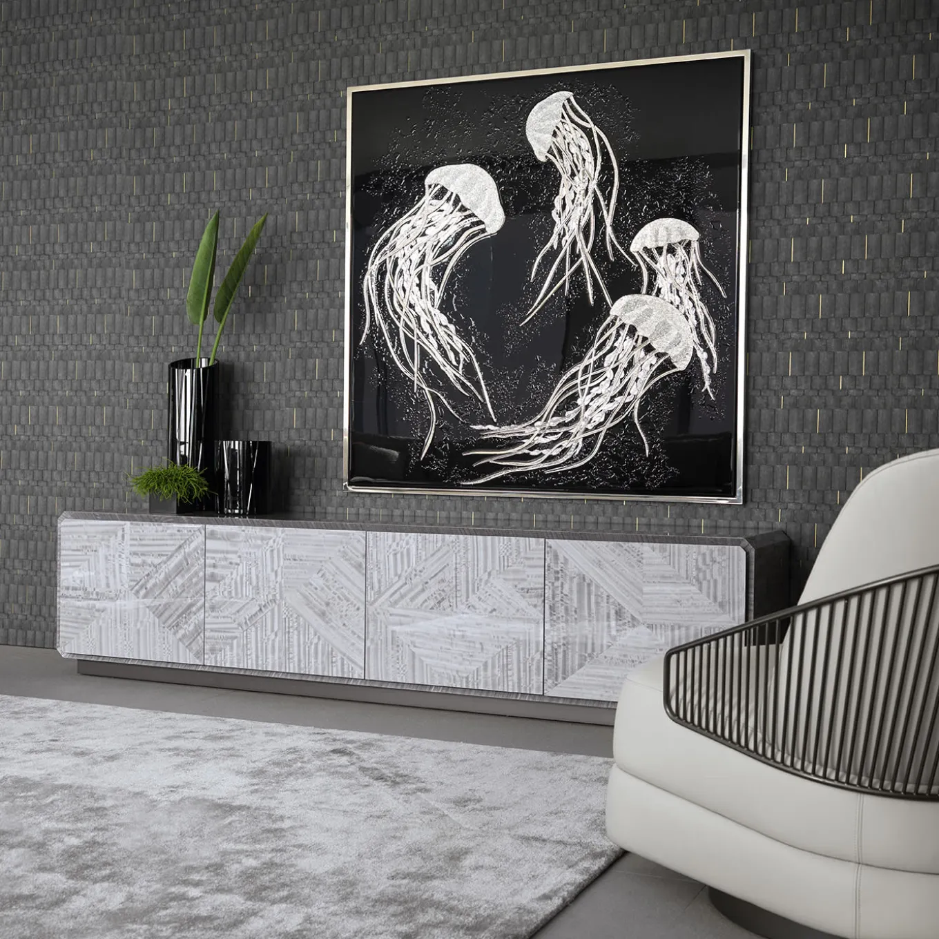 Scoprite questo quadro con struttura in legno e cornice in acciaio inox. Base in resina epossidica con protezione UV in combinazione con cristalli “Swarovski”, vetro a specchio trasparente tagliato a mano e foglie d’argento.