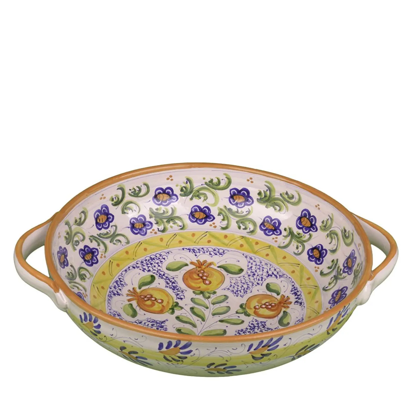 Perfetta per servire un’insalata fresca o un piatto di pasta fredda in una soleggiata giornata estiva, questa splendida insalatiera è realizzata interamente a mano in maiolica. Con le sue tonalità vivaci, il pezzo vanta un motivo floreale dipinto a mano all’interno e all’esterno della sua silhouette rotonda con manici. A causa della sua natura artigianale, può differire leggermente dall’immagine.