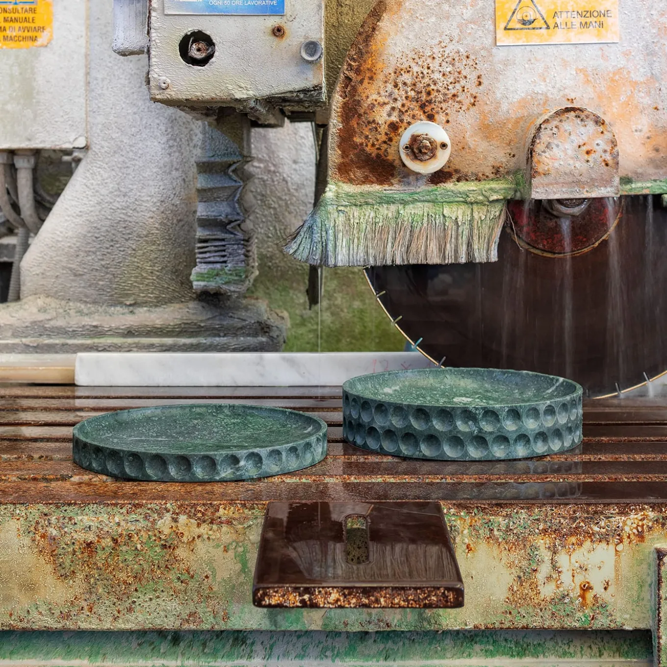 La collezione Mirage nasce dalla matericità monolitica della pietra. Forma e funzione coincidono, creando un elemento senza fronzoli, che nasce dalla sottrazione dei materiali. Spazi pieni e vuoti si alternano tra loro e creano sfumature di luce che si dissolvono grazie all’accostamento dei decori. È un contenitore di oggetti pieno di ciò che lo circonda e che si riflette sulla sua superficie. Questo oggetto ha fatto parte della , esposta presso fino a maggio 2023.