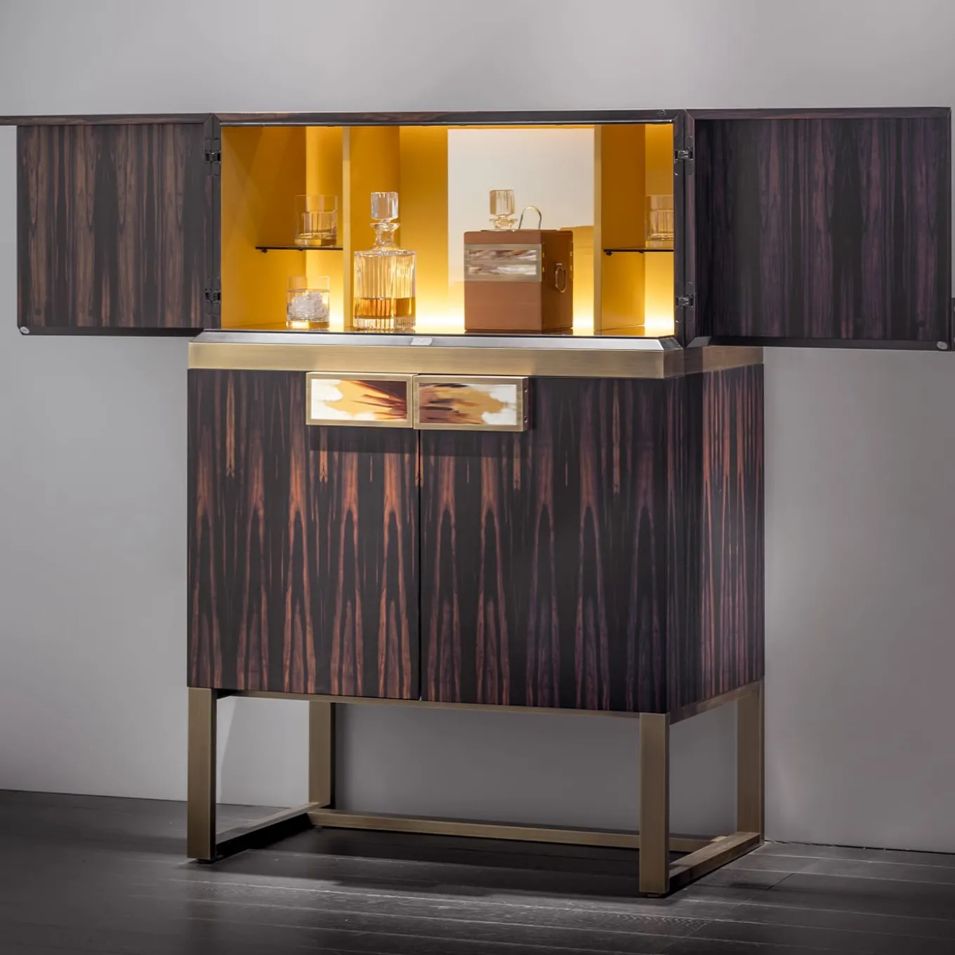 Magnifica aggiunta a una casa moderna, dove sarà accattivante e funzionale allo stesso tempo, questo mobile bar poggia su una struttura in ottone brunito con angoli curvi. Il pezzo è in prezioso ebano macassar verniciato opaco. L’elemento distintivo è la superba decorazione delle maniglie in corno opaco e ottone bronzato. All’interno, il mobile ha un interno in legno di mandarino con finitura opaca ed è dotato di portabicchieri e di un frigorifero. Sono disponibili altre finiture e dimensioni: consultare il Concierge.
