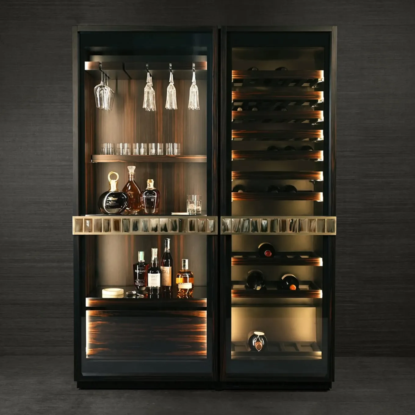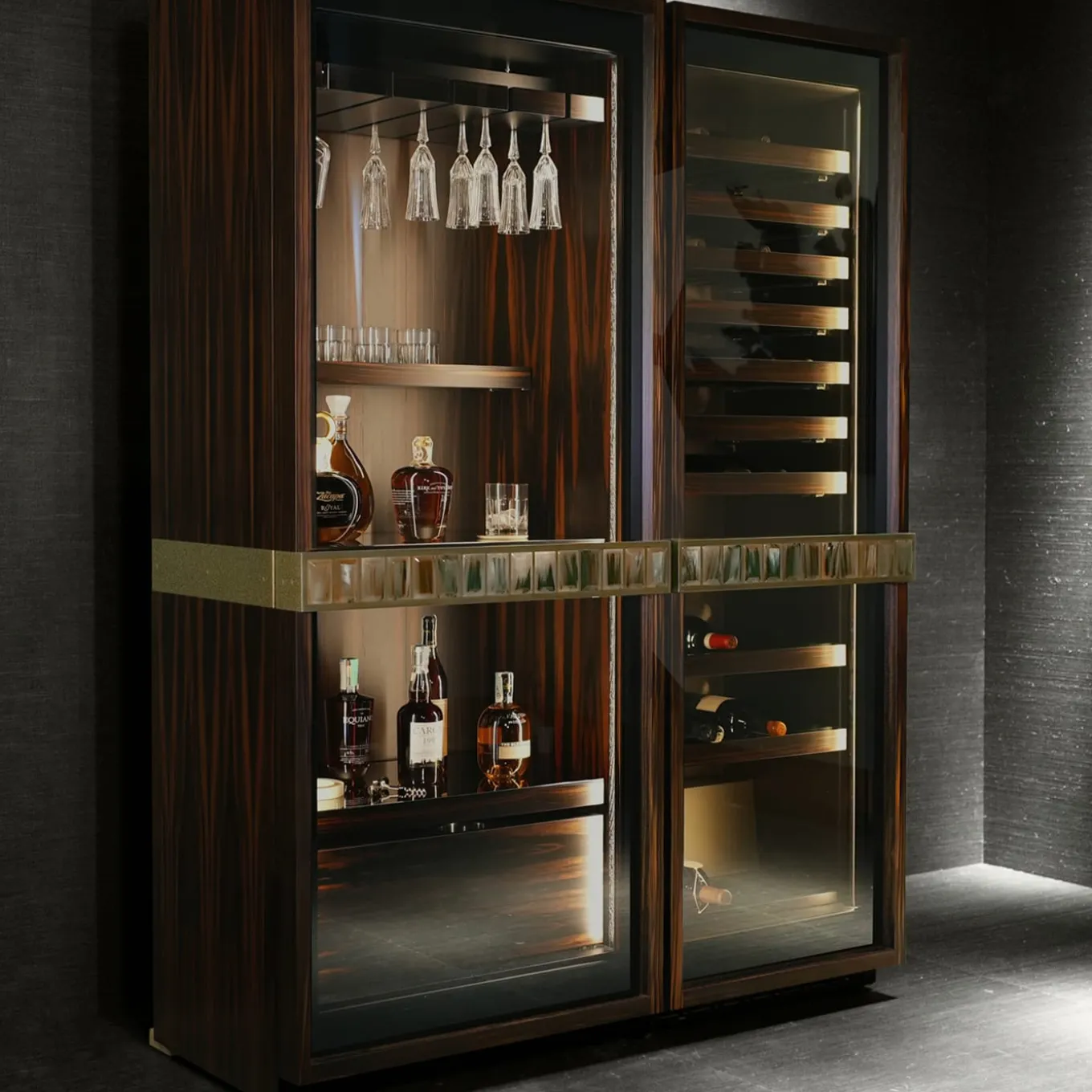 Cantinetta per vini impiallacciata in ebano Macassar opaco. Maniglie in ottone brunito con gemme di corno sfaccettate. La cantina è dotata di vassoi scorrevoli per conservare 24 bottiglie di vino, 15 bottiglie di champagne e 12 bottiglie magnum. Dotata di sistema di refrigerazione multi-temperatura. La cantina viene fornita con quattro sottobicchieri rotondi in corno e lacca avorio, un secchiello per il ghiaccio in ebano Amara opaco e corno, un cavatappi in corno e acciaio inox. Per maggiori dettagli, contattare il Concierge. Bicchieri e bottiglie non sono inclusi.