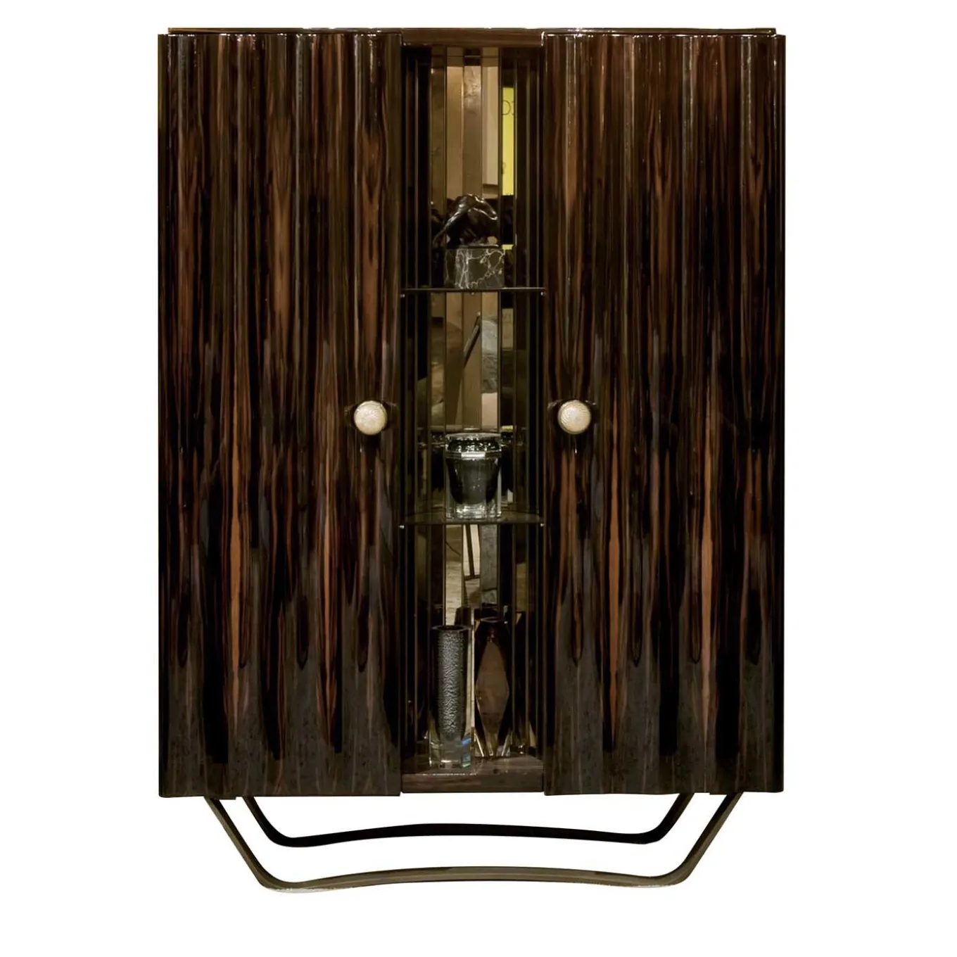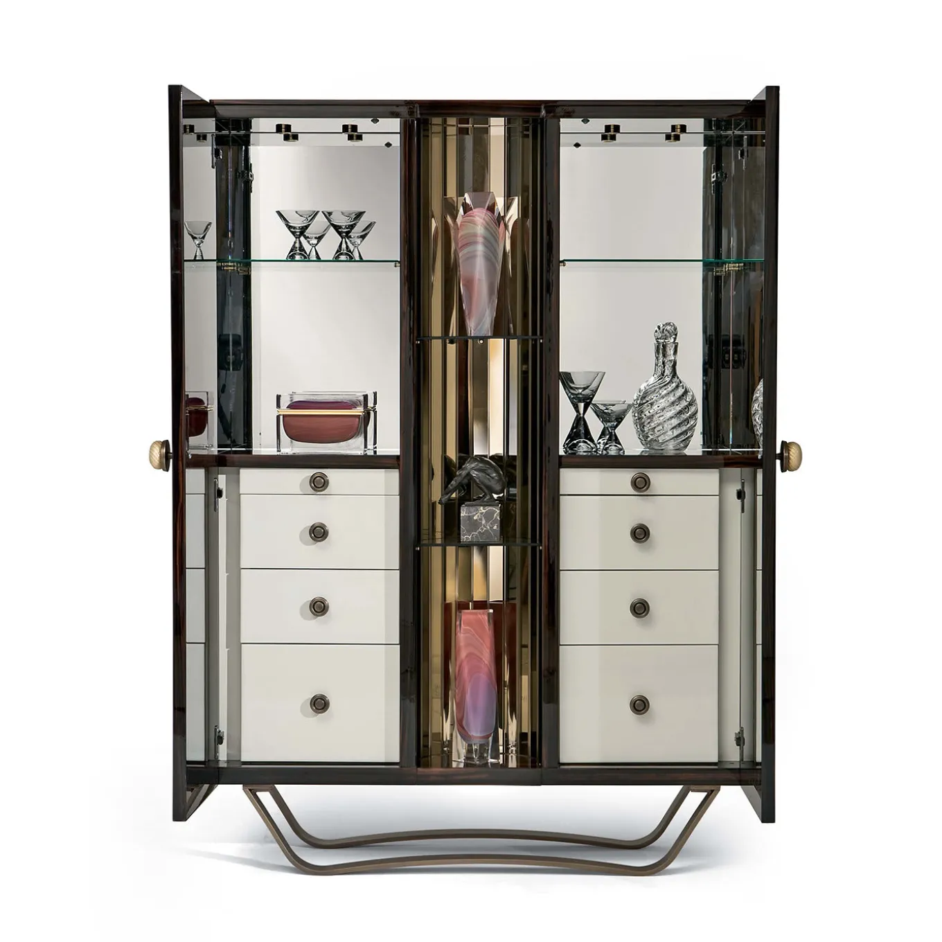 Realizzato con la massima attenzione ai dettagli, questo mobile bar è un pezzo unico di arredamento funzionale che esemplifica la perfetta fusione di forma e funzione. La struttura in legno laccato lucido è arricchita da sfumature marroni e nere. Poggiato su una base in metallo bronzato, il piano presenta tre sezioni: una scaffalatura a specchio aperta al centro e due unità laterali con ante che racchiudono uno spazio ben organizzato con ripiani in cristallo, cassetti in pelle, illuminazione interna e schienale a specchio. Questo mobile sarà un punto focale di grande effetto in qualsiasi arredamento.