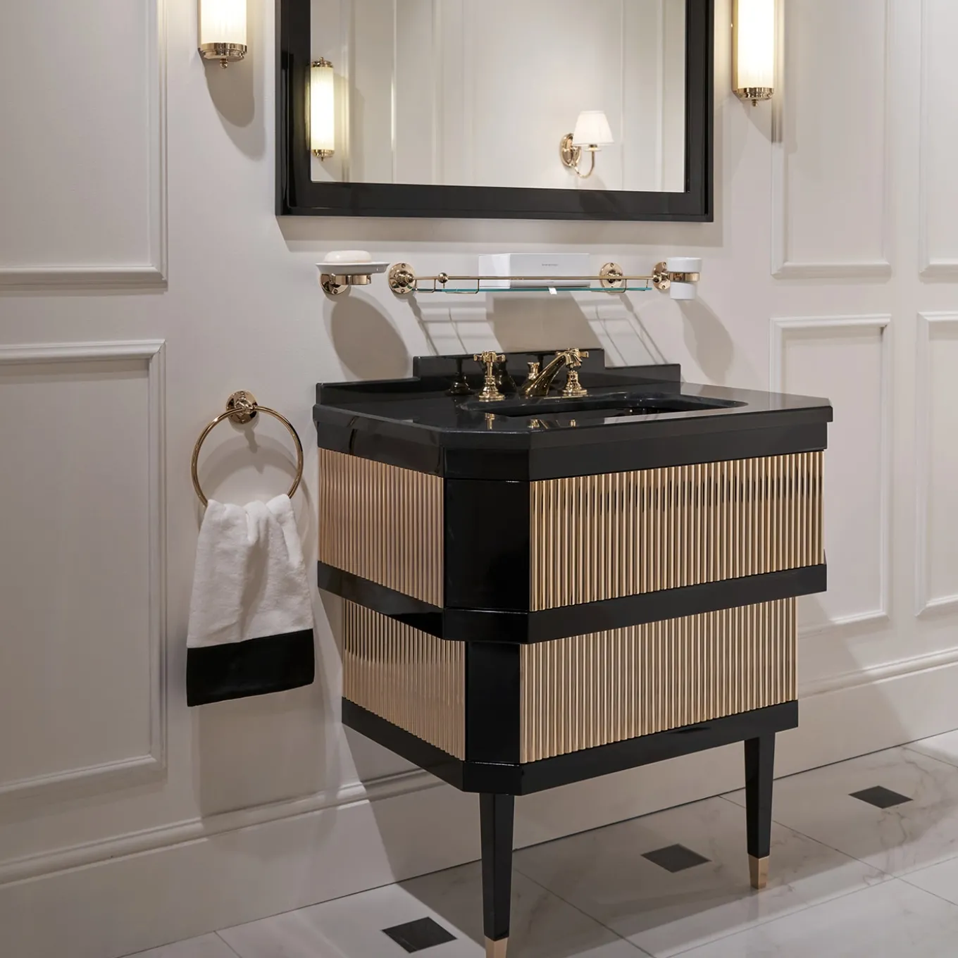 Materie prime preziose, lavorazioni artigianali ricercate e uno stile unico che distilla e rilegge in modo nuovo il meglio del design europeo del primo Novecento fanno di questo mobile un vero e proprio gioiello per la sala da bagno. L’elegante struttura in legno laccato lucido sorregge il top in marmo Granito Nero Assoluto e incornicia le stecche di ottone. La rubinetteria non è inclusa. Contattare il Concierge per ulteriori informazioni e opzioni.