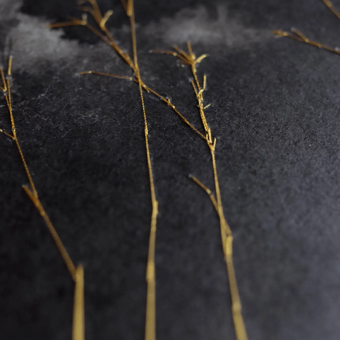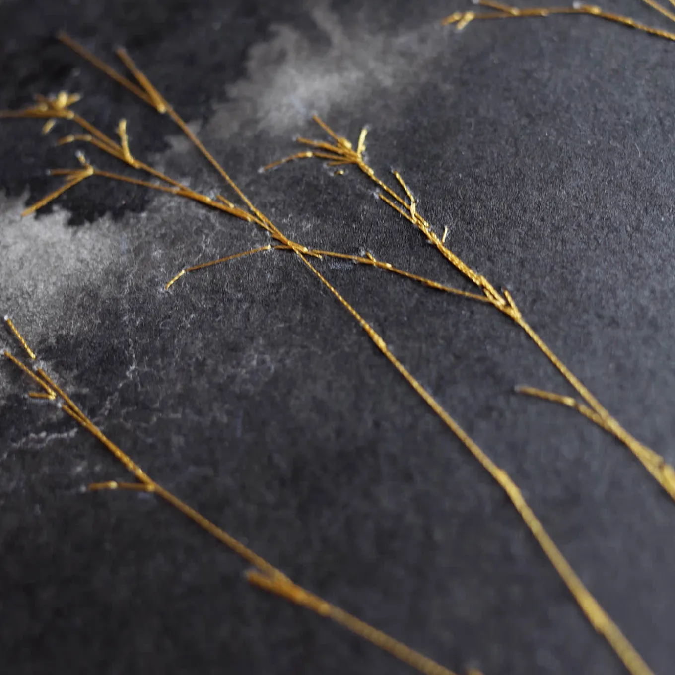 Graziosi ramoscelli dorati sullo sfondo di un cielo notturno e nuvoloso: è il soggetto che caratterizza questo superbo dipinto su carta andina fatta a mano (300 g/mq). Inchiostro, acqua e ricami in filo d’oro che simboleggiano la ricerca della luce, contribuiscono alla sua singolare estetica, capace di distillare quasi un ritmo tra scelta e casualità, tra le facce della stessa opera. Fornito senza cornice.