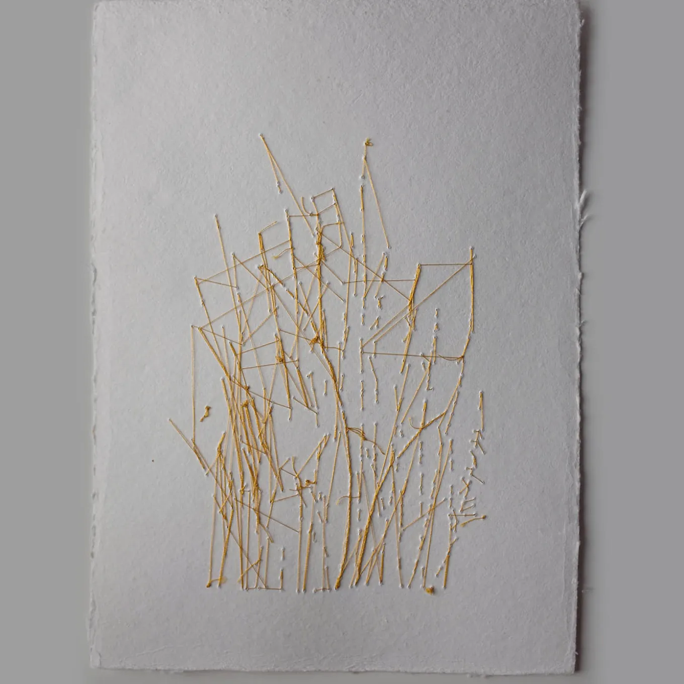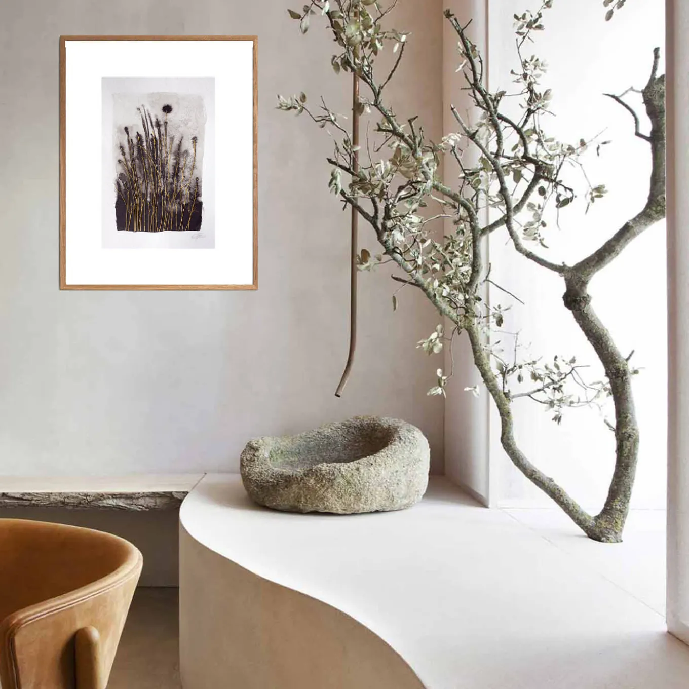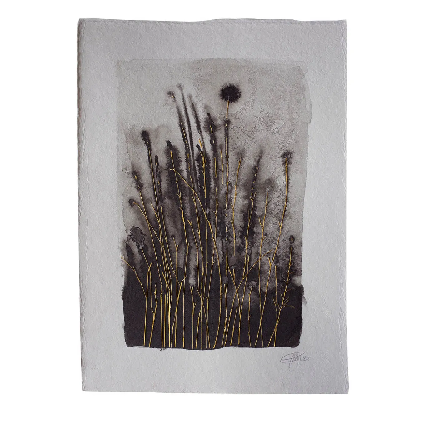 Questo sublime dipinto su carta andina fatta a mano (300 g/mq) raffigura un poetico scorcio floreale ottenuto grazie a una sapiente combinazione di inchiostro scuro e filo d’oro, utilizzato per creare ricami a stelo che simboleggiano la ricerca della luce. Scelta e casualità si intrecciano incessantemente, creando un aspetto singolare su entrambi i lati. Questa opera d’arte unica viene fornita senza cornice.