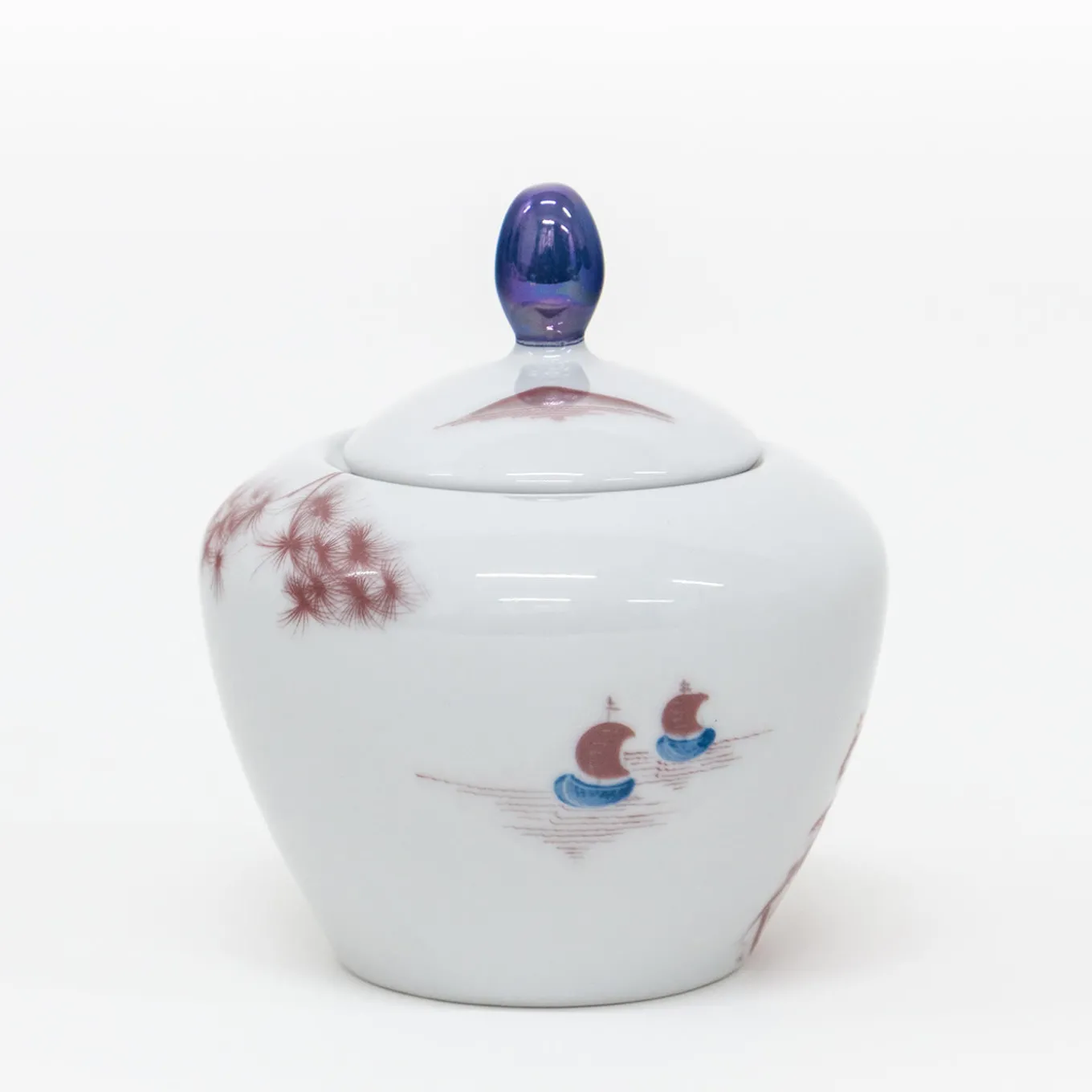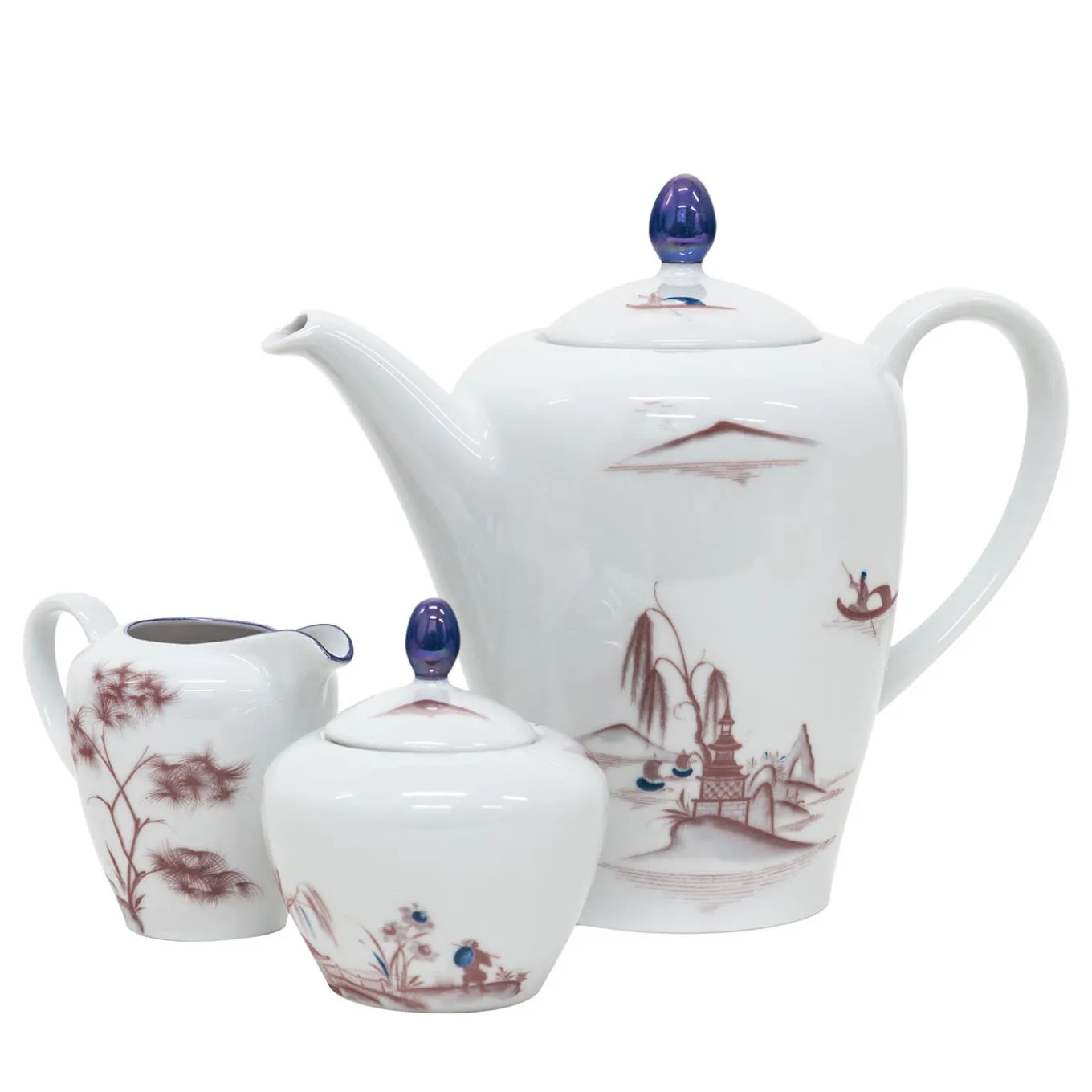 Evocando la serena semplicità dell’estate, questo servizio da tè, composto da una tazza da tè, una zuccheriera e una lattiera, presenta un dipinto fatto a mano di un idilliaco paesaggio giapponese ispirato alle tradizionali immagini Imari, che si distinguono per la loro tavolozza a tre colori.