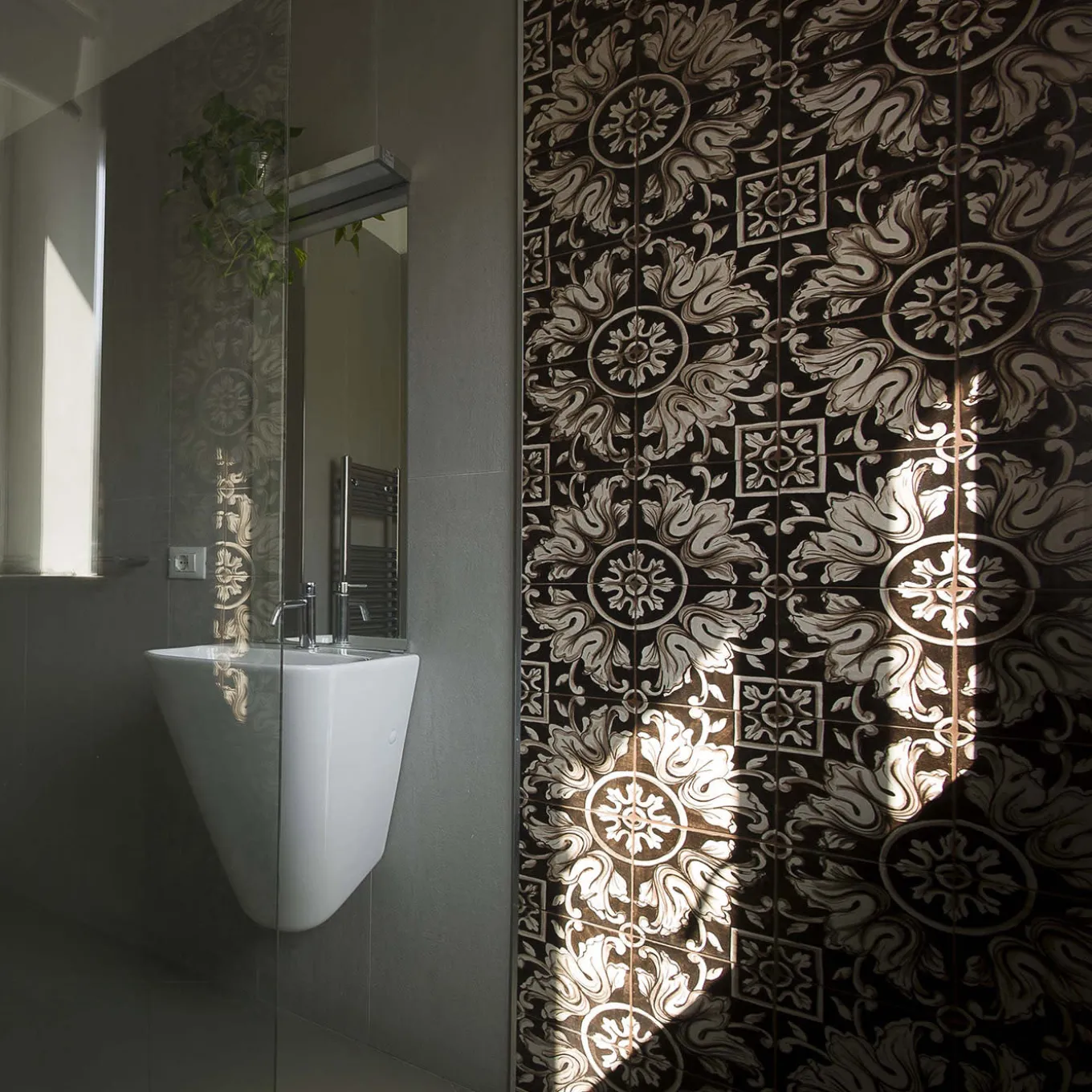 Caratterizzate da un’estetica sofisticata ed elegante, queste maioliche artigianali emanano la grandezza e l’originalità dell’artigianato ceramico siciliano. Realizzate in terracotta mista a pietra vulcanica macinata, queste piastrelle della Collezione Natura sono ornate da elementi a fronde color avorio che ricordano i decori tardo-rinascimentali. Le fronde partono dal disegno centrale e si irradiano intorno ad esso fino agli angoli, creando un vortice dinamico di forme e colori su sfondo nero. Ideale come pannello da parete in cucina, sala da pranzo o ingresso.