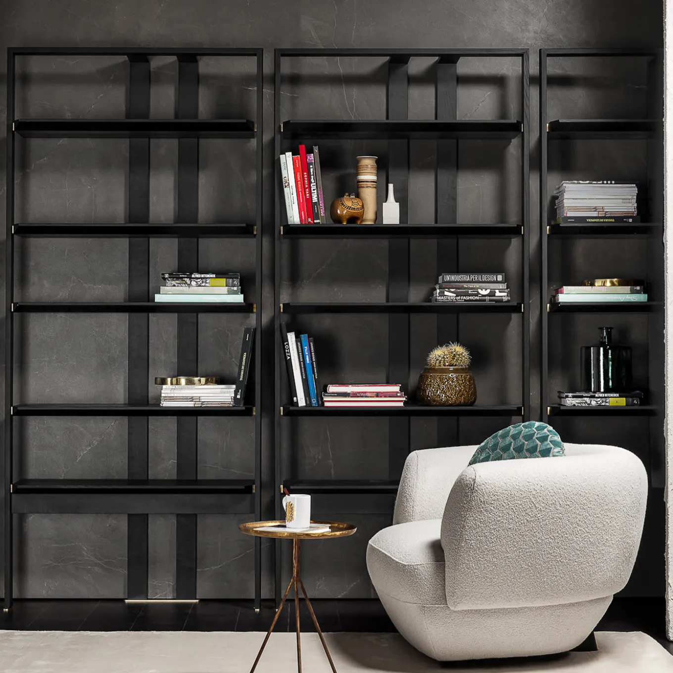 Questa raffinata libreria in larice spazzolato tinto nero si distingue per il suo design arioso, dove la combinazione ortogonale degli elementi crea un effetto visivo accattivante. È dotata di cinque ripiani aperti per organizzare le collezioni di libri ed esporre preziosi oggetti decorativi. Le finiture metalliche dorate creano punti luminosi che ravvivano l’insieme. Una variante bassa è disponibile su richiesta al Concierge.