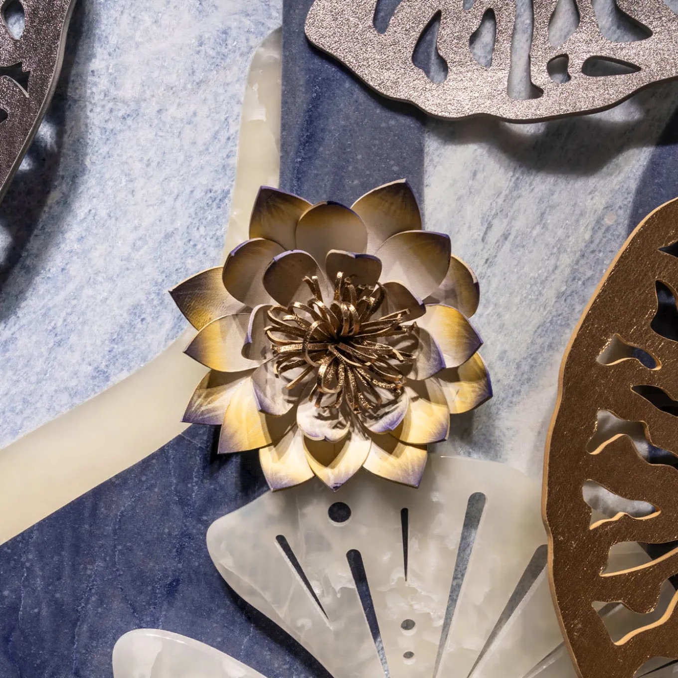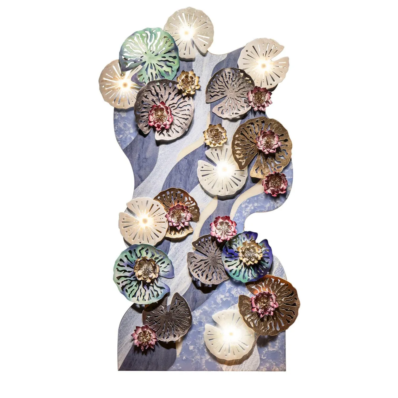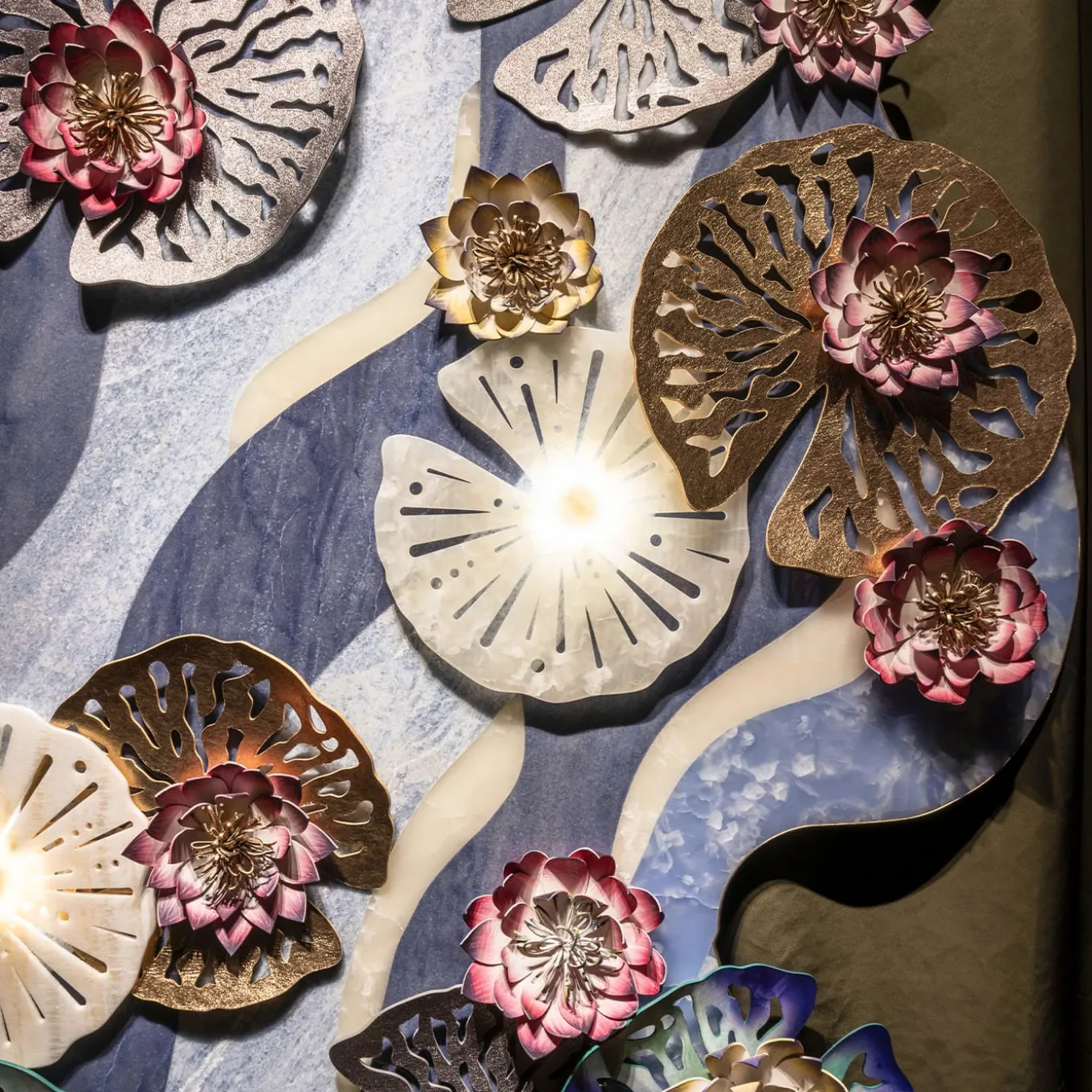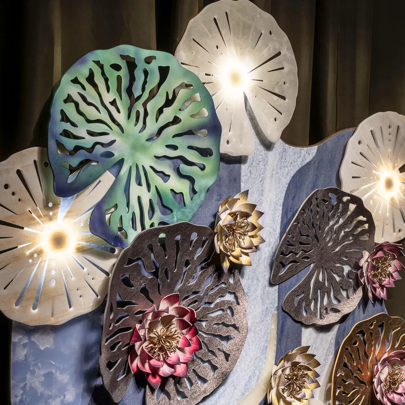Ispirato alle “Ninfee” di Monet, questo pannello reinterpreta il capolavoro dell’artista in una moderna installazione verticale. In collaborazione con Budri, rinomata per la sua esperienza nel settore del marmo e delle pietre preziose, l’opera fonde materiali lussuosi come il marmo, l’onice e la pelle. Gli intricati fiori di loto e le ninfee, realizzati in pelle dipinta a mano e marmo intarsiato, creano una composizione dinamica ed eterea. Con colori luminosi e un design scultoreo, trasforma qualsiasi spazio.