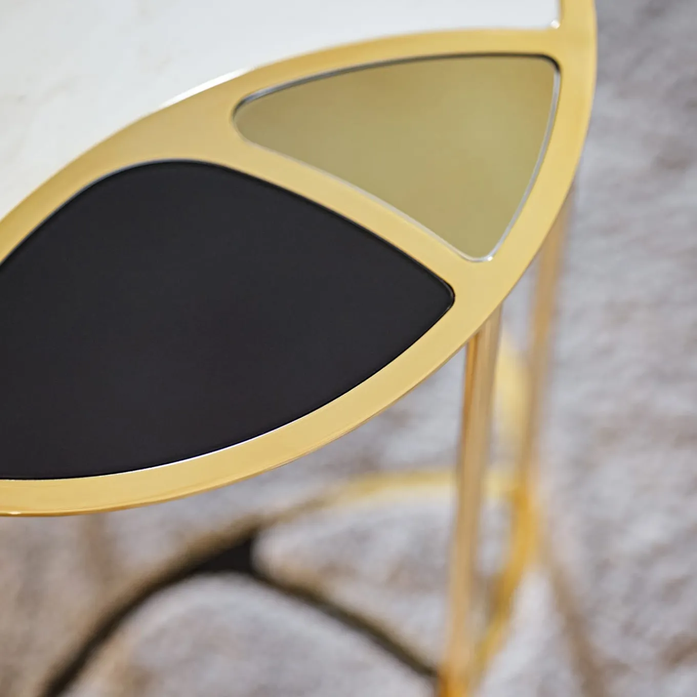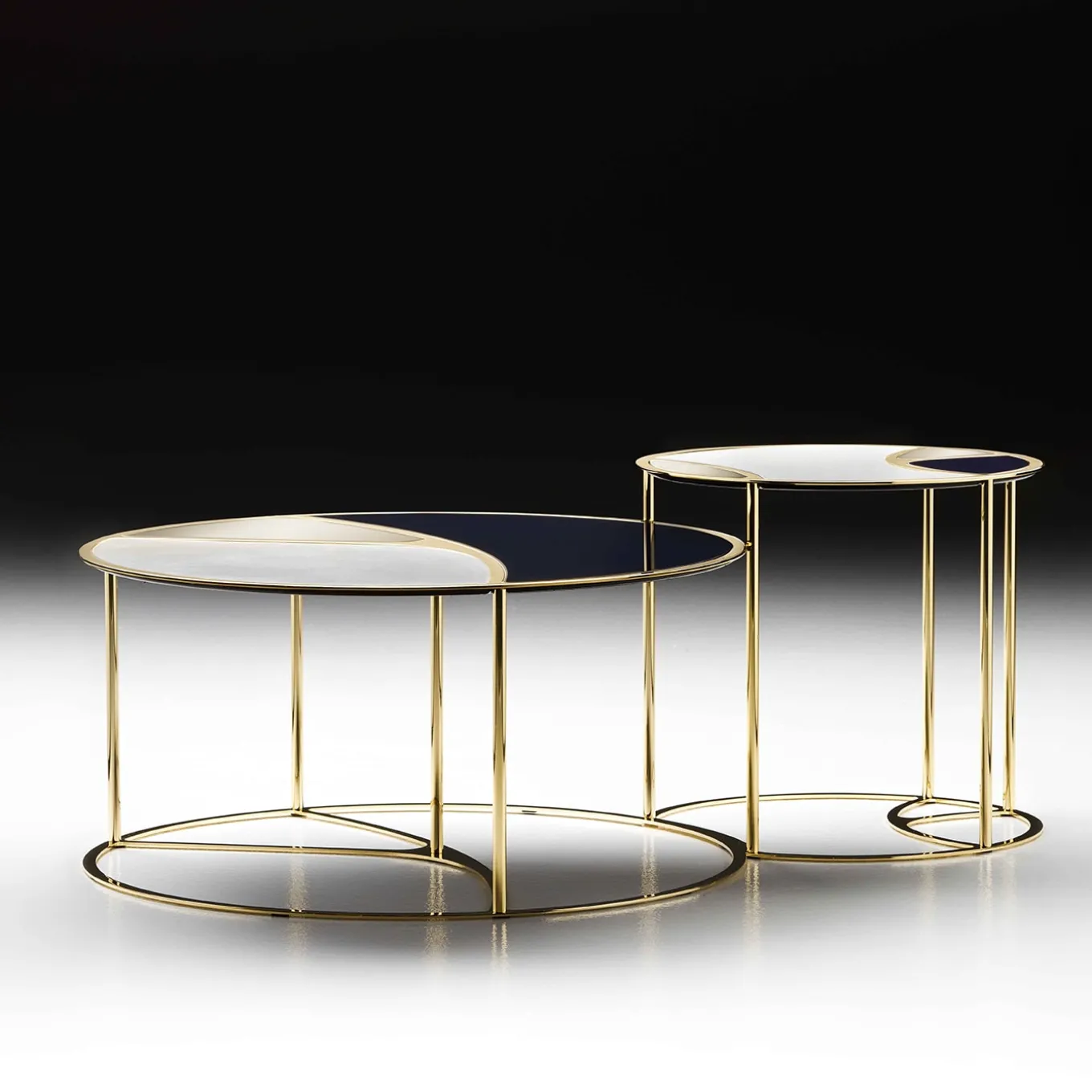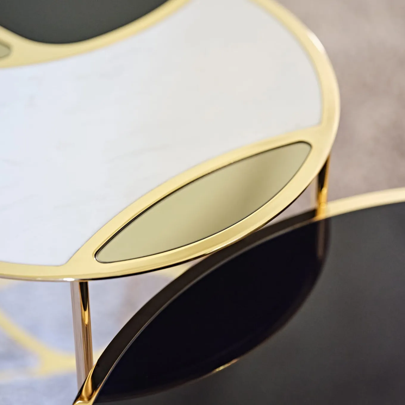Linee vagamente fitomorfe o geometriche tracciano le ariose silhouette in metallo tagliato al laser di questa coppia di tavolini. Una raffinata combinazione di marmo Calacatta Vagli Oro, specchio bronzato e vetro retroverniciato conferisce ai piani rotondi un design intrigante, ricco di finiture e contrasti cromatici. Contattare il Concierge per le varianti disponibili.