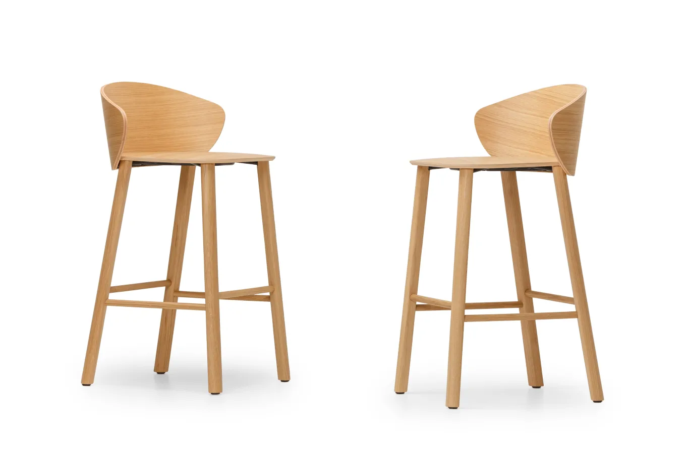 Questo sgabello da bar è realizzato in legno di quercia con finitura naturale.