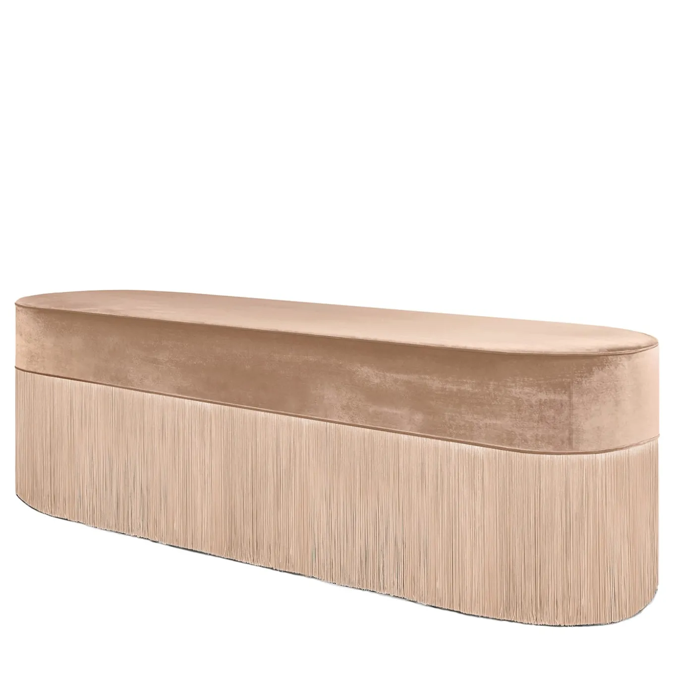 L’eleganza sobria incontra l’eleganza sartoriale in questa panca di pregio. La tranquilla raffinatezza dei suoi profili armoniosi e della sua tinta unita beige è ravvivata dalla presenza di una serie di frange in viscosa che avvolgono la sua silhouette allungata in faggio. L’impeccabile comfort è assicurato dalla seduta riccamente imbottita e rivestita in velluto pregiato. Si prega di esplorare le personalizzazioni disponibili contattando il Concierge. Ogni pezzo su misura è impresso sul fondo della fodera del pouf e firmato, numerato e datato personalmente dal designer.