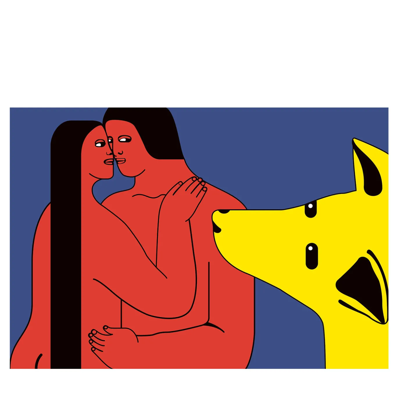 Un incontro intimo tra un uomo e una donna, con la testa gialla e vibrante di un cane che punta verso di loro, descrive la scena accattivante e quasi segreta che questa stampa su metallo mette in mostra. Costringendo l’osservatore ad adottare un punto di vista invadente, la scena acquista ulteriore intensità grazie alla scelta di linee nettamente contrastanti e di toni vibranti. Una serie limitata di tre pezzi.