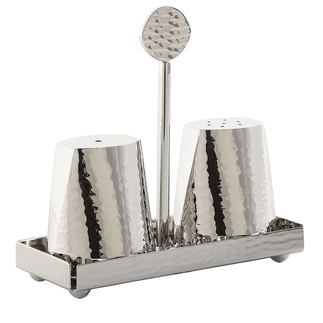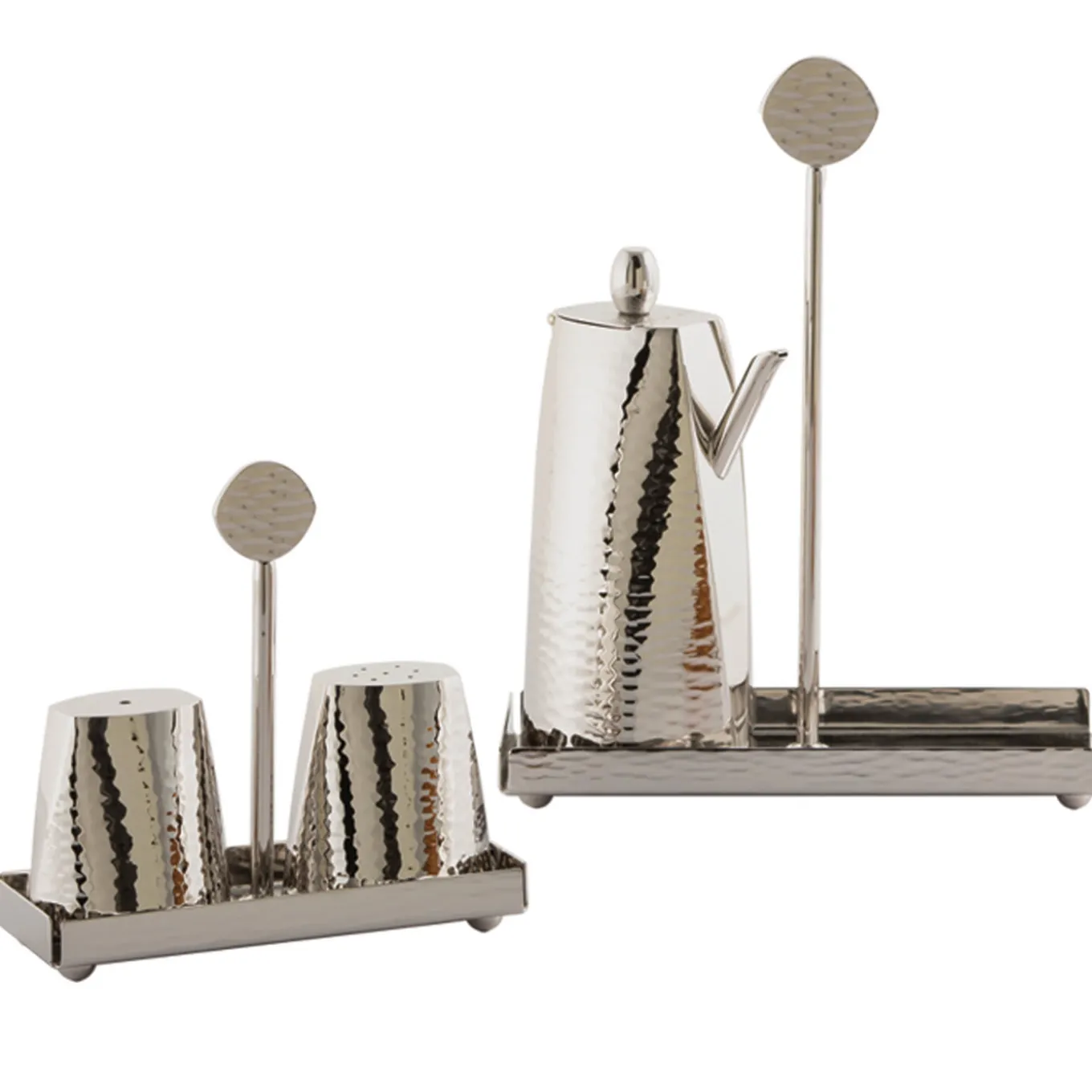 Questo oggetto grazioso e funzionale è realizzato con cura in ogni dettaglio. Il vassoio rettangolare è tagliato e piegato a mano, quindi martellato lungo il bordo esterno. I quattro piedini sono saldati alla base, mentre il gambo centrale è sormontato da un manico ovale anch’esso martellato a mano per adattarsi alla texture delle saliere e pepiere. Una lavorazione così dettagliata aggiunge un tocco di lusso a questo set che valorizzerà l’aspetto di qualsiasi tavola.
