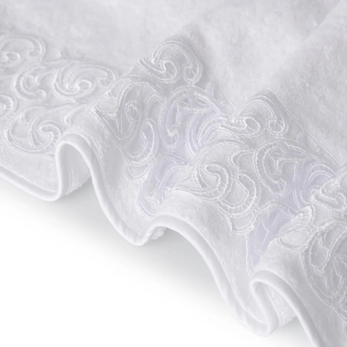 Questo stupendo set di tre asciugamani, che emana una raffinatezza senza tempo, è un meraviglioso esempio di artigianato tradizionale. Composto da asciugamano per gli ospiti (40×60 cm), asciugamano per le mani (60×100 cm) e asciugamano per il bagno (110×100 cm), ogni pezzo è abilmente realizzato a mano in spugna bianca di prima qualità, impreziosito da una finitura sbieca e da un raffinato pizzo tono su tono sul lato corto.