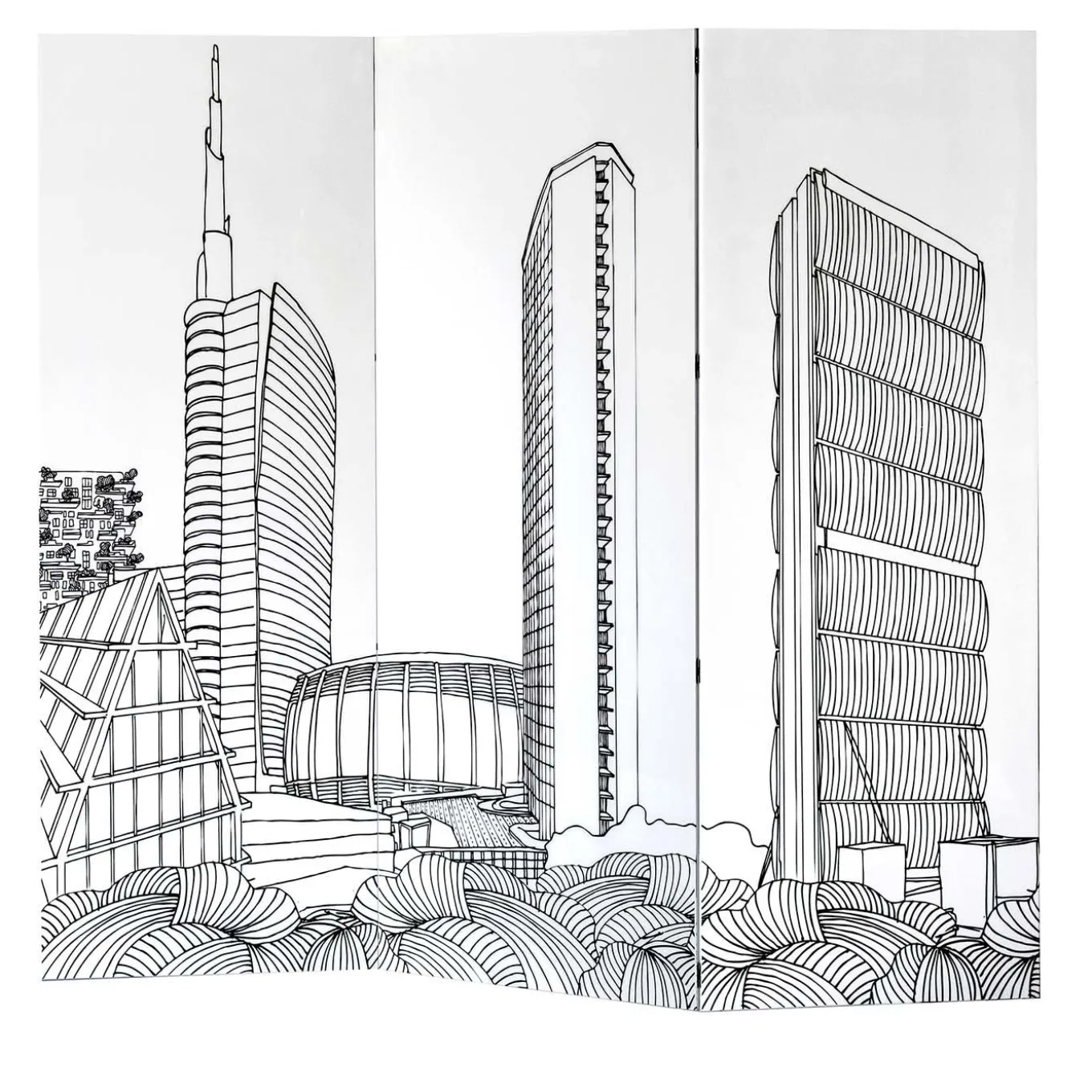 Paravento originale a 3 pannelli (ciascuno misura 60 cm x 180 cm di altezza), realizzato in legno laccato con finitura lucida, il retro è laccato in bianco. Il paravento pieghevole è stampato con le illustrazioni di Anna Sutor. La bella stampa rappresenta la visione artistica/architettonica della Milano contemporanea dell’illustratrice. Le misure complessive sono: 180 x 180 cm.