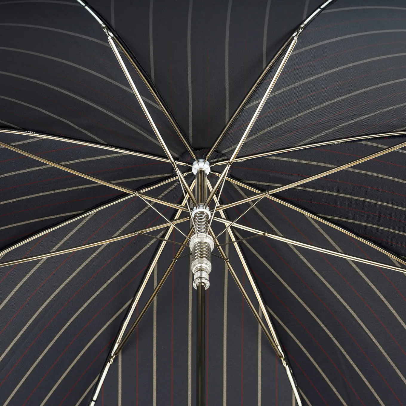 Ombrello a apertura automatica con manico in resina placcata argento a forma di testa di scimmia, abbinato a una copertura in tessuto a righe. Misura 95 cm di lunghezza con un diametro di 110 cm, offrendo una copertura media. Il design bilancia dettagli eleganti con funzionalità pratica, adatto all’uso quotidiano e per aggiungere un tocco distintivo all’abbigliamento per le giornate di pioggia.