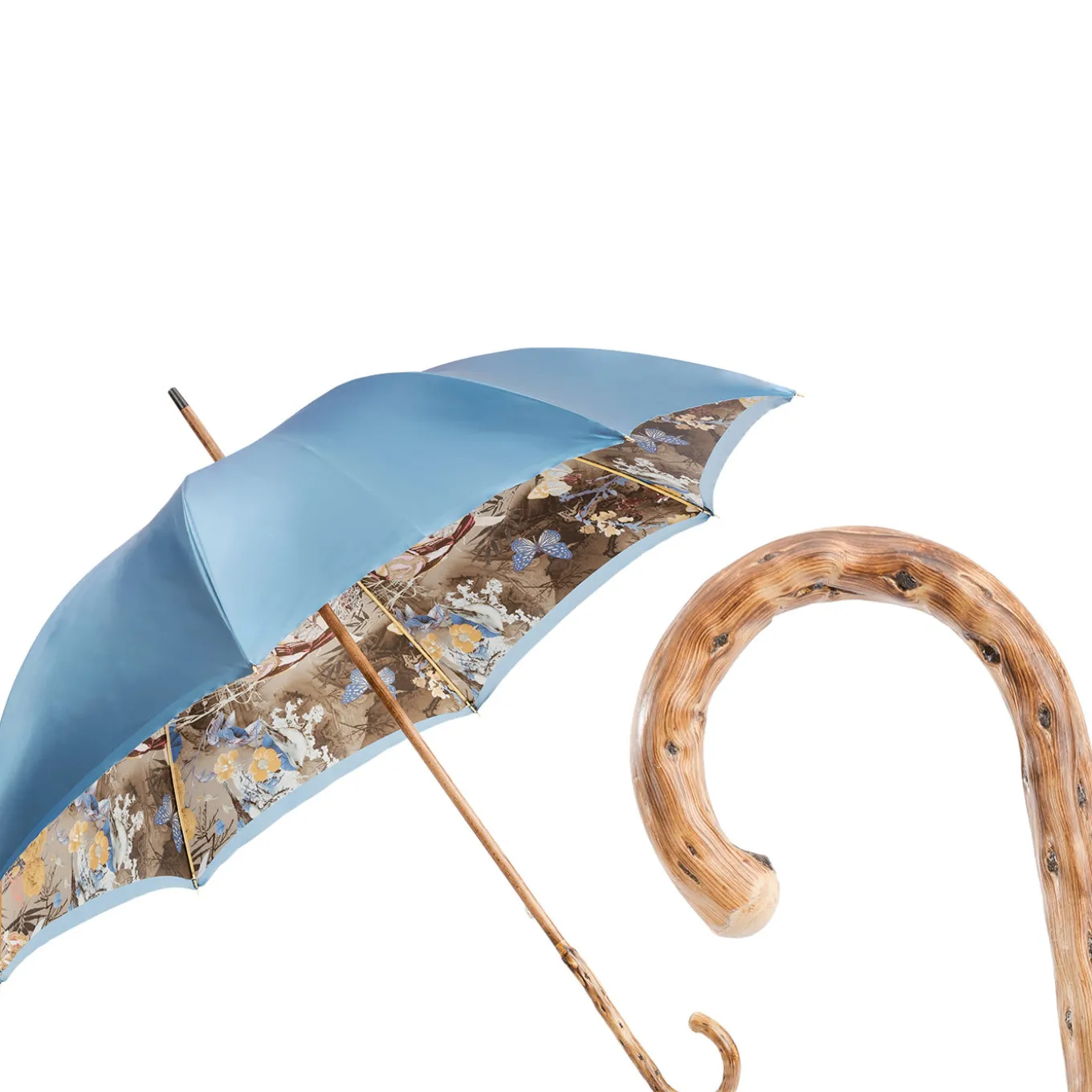 Realizzato a mano in Italia, questo ombrello di naturale bellezza presenta un fusto in legno di ginestra lungo 93 cm e un’apertura manuale. Il baldacchino misura 102 cm ed è realizzato in doppio tessuto di poliestere al 100% di colore azzurro all’esterno e decorato con un motivo naturale all’interno.