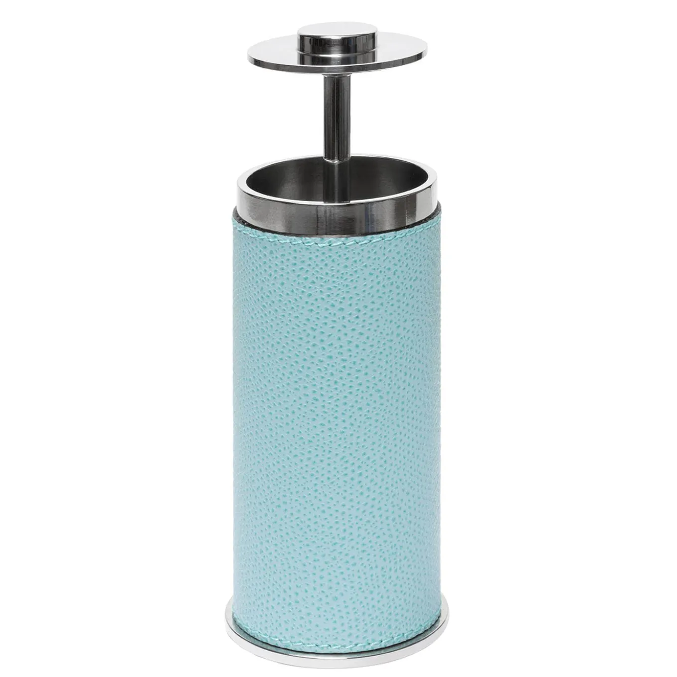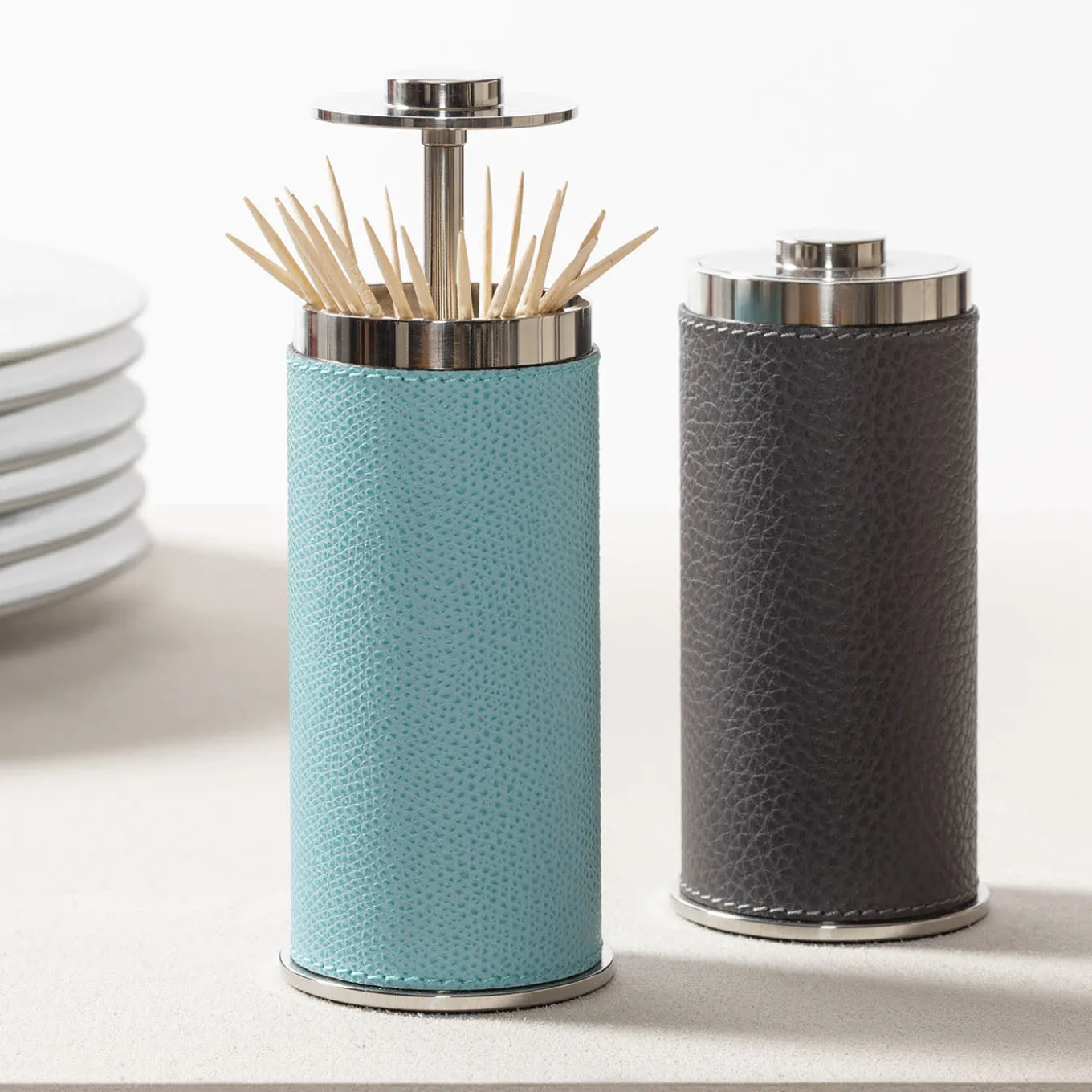 Lo stuzzicadenti Otello è una struttura in acciaio inossidabile parzialmente rivestita in pelle. Il suo design discreto è caratterizzato da una parte superiore a pulsante che consente un facile accesso al dispenser.