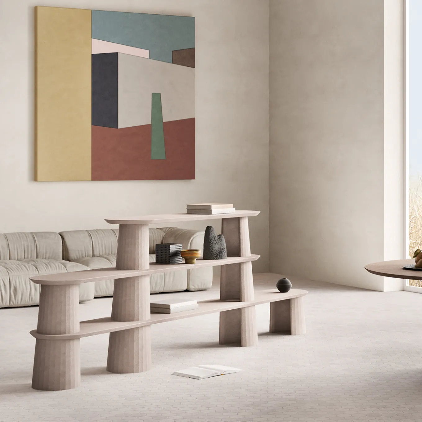 Suggestiva opera d’arte che rende omaggio ai movimenti artistici del surrealismo, del primitivismo, della metafisica e del brutalismo, questa moodboard da parete combina volumi geometrici di forte valenza architettonica arricchiti da un accattivante gioco di luci e ombre. Disegnata da Marialaura Rossiello Irvine per la Collezione Fusto di Forma&Cemento, è interamente realizzata in cemento. L’immagine raffigura un piccolo parallelepipedo immerso in un insieme di volumi alti e spessi scanditi dalle tonalità del rosso, del verde petrolio e del grigio. Altre dimensioni sono disponibili su richiesta al Concierge.