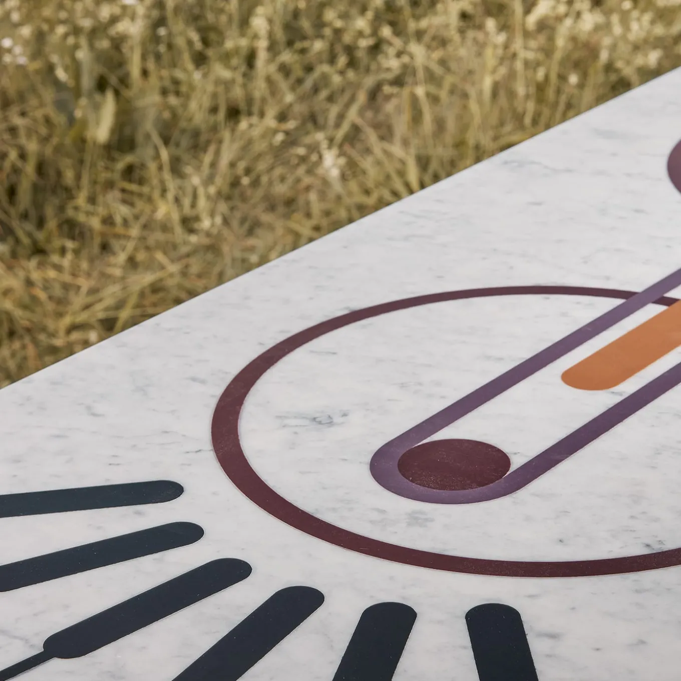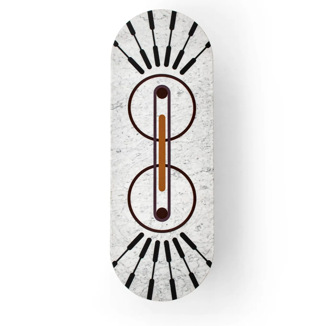 Ione nasce dall’incontro tra forme morbide e sofisticati intagli grafici. Cerchi, linee e orbite fuse insieme danno vita a una panca in marmo e resina che sembra provenire da un altro mondo.