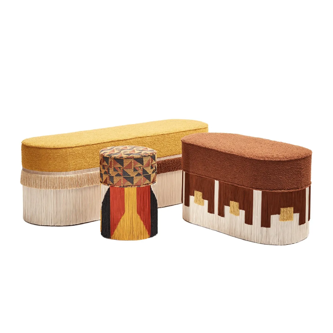 Superbo accessorio per una zona giorno moderna, la panca Mali di Lorenza Bozzoli si presenta al meglio con il pouf abbinato per un tocco distintivo. La seduta è imbottita in marrone e completata da una gonna con frange in viscosa e lurex con motivi di arte nativa. Ogni pezzo è numerato e firmato dall’artista. Completamente personalizzabile su richiesta, si prega di contattare il Concierge per i dettagli.
