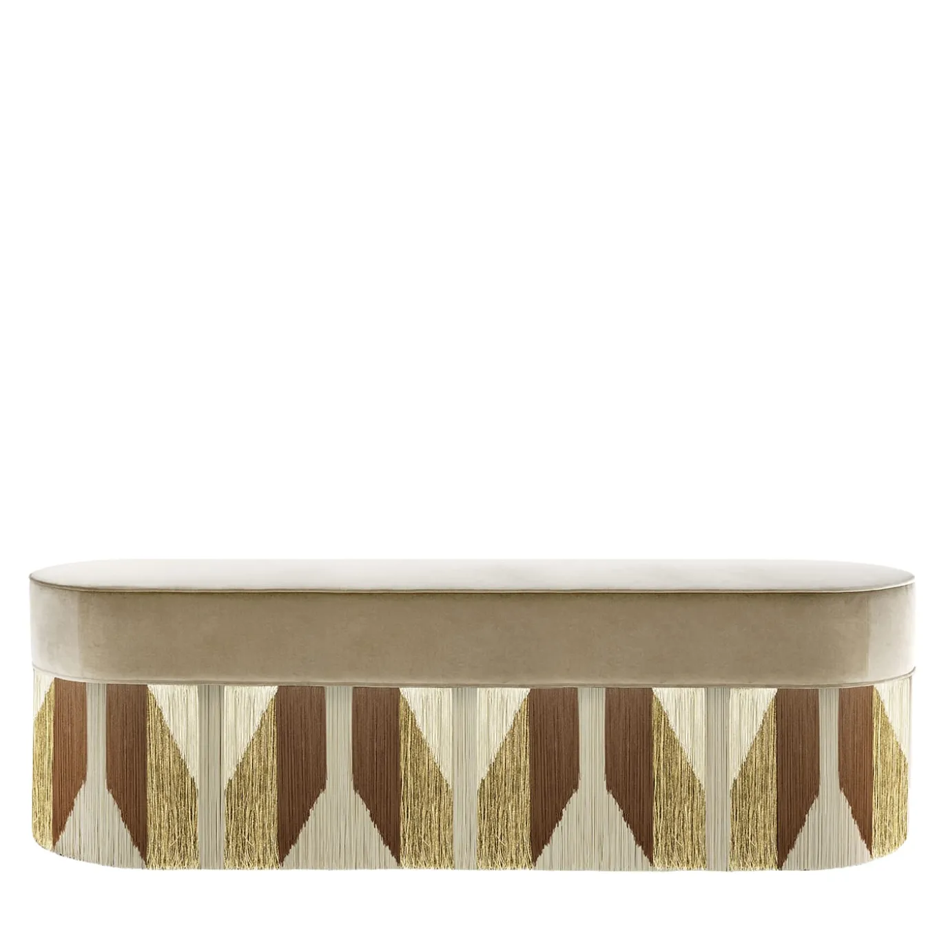 Eccellenza sartoriale ed eleganza cromatica si fondono in questa superba panca artigianale. Caratterizzata da una robusta anima in faggio, si distingue per la serie di frange in viscosa nei toni della terra, disposte con cura per creare un intrigante motivo di ispirazione tribale. Il comfort perfetto è garantito dall’ampio sedile curvilineo rivestito in pregiato velluto beige. Contattare il Concierge per le opzioni di personalizzazione. Ogni pezzo su misura è impresso sul fondo della fodera del pouf e firmato, numerato e datato personalmente dal designer.