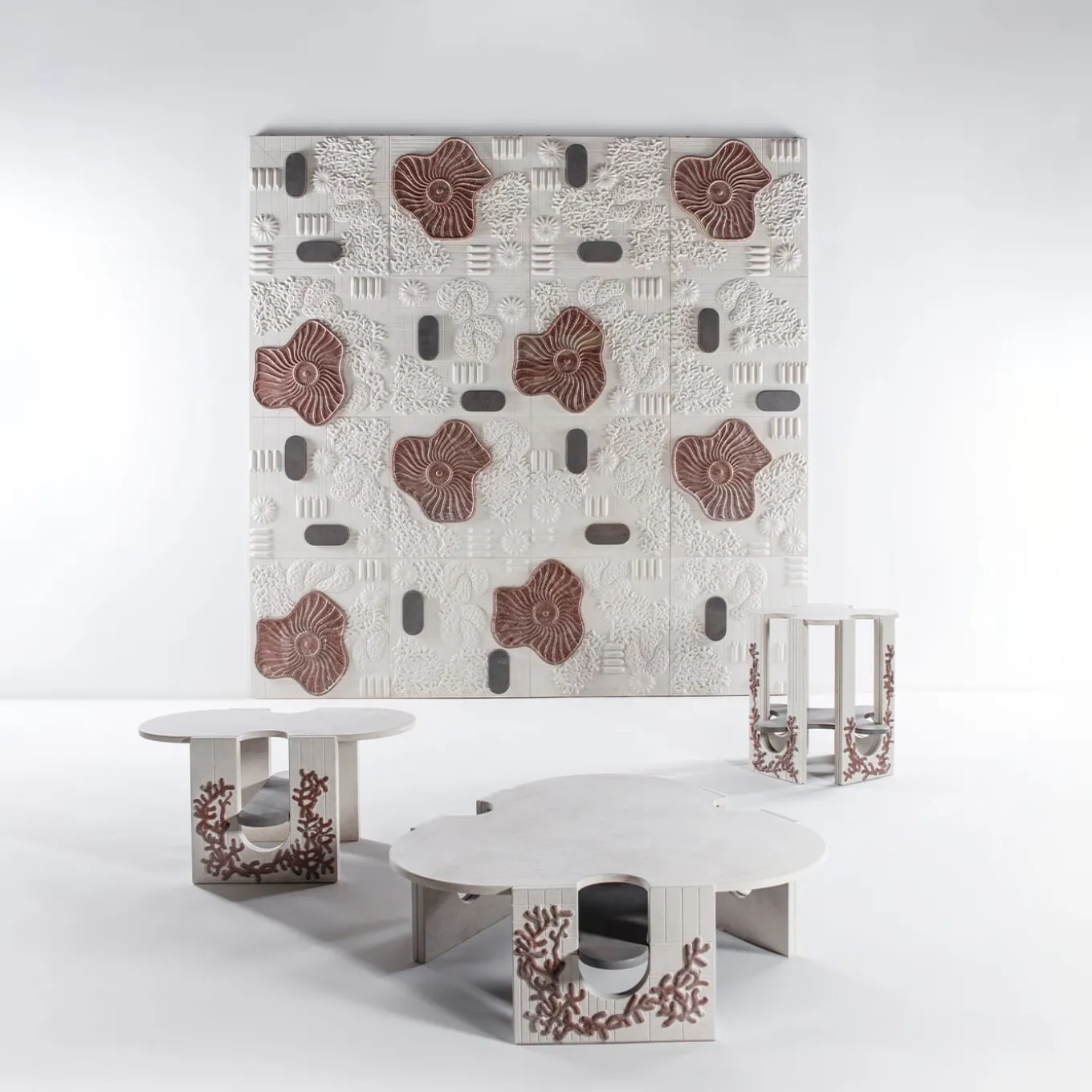 La collezione Anemone è incentrata sul paesaggio marino. Attraverso il suo linguaggio creativo unico, Elena Salmistraro interpreta le misteriose creature che abitano le profondità marine. Anemone è un pannello decorativo modulare in marmo che stratifica piante, molluschi e organismi viventi su una griglia di coordinate geografiche, creando una composizione dinamica che si estende dai fondali marini alle sagome stilizzate delle barche.