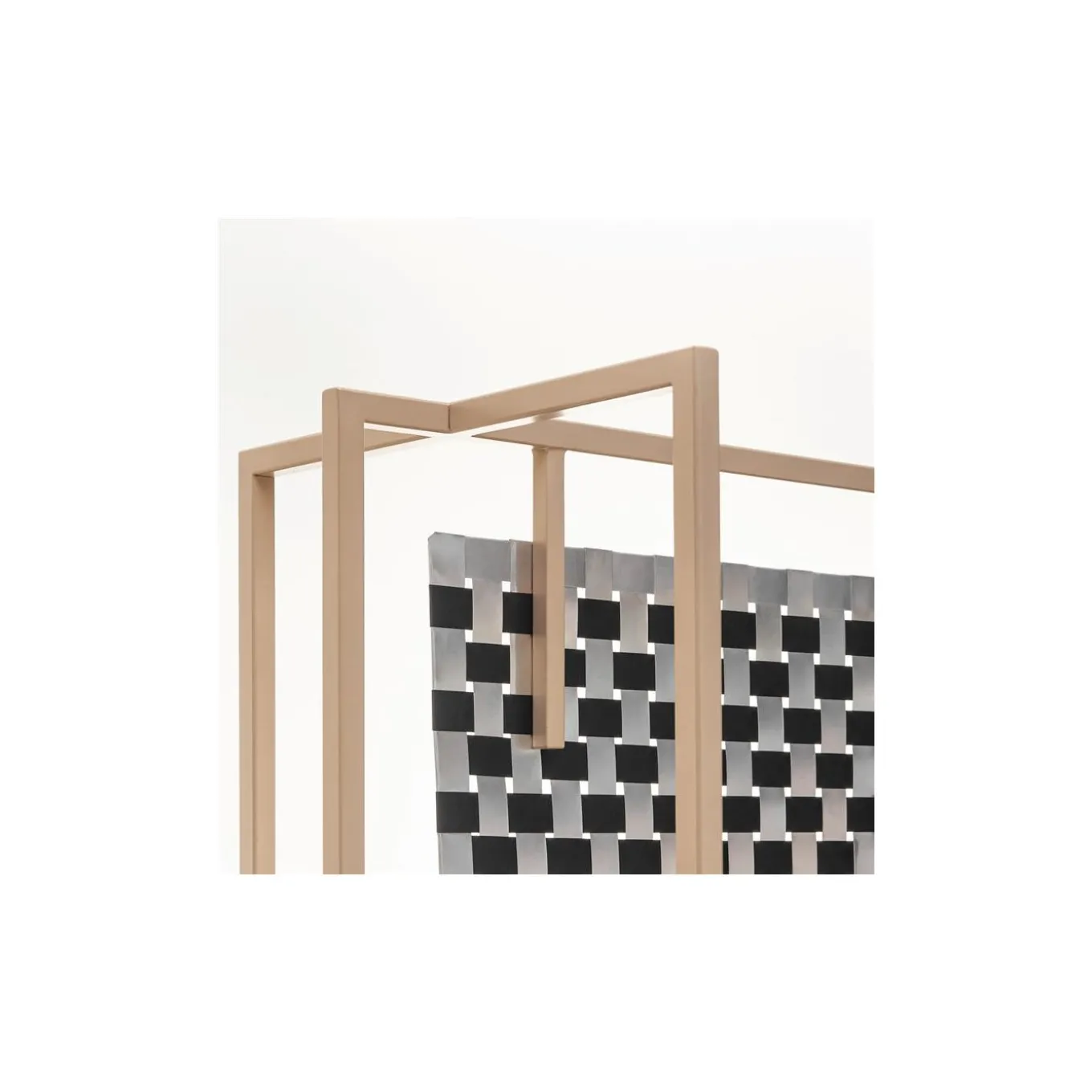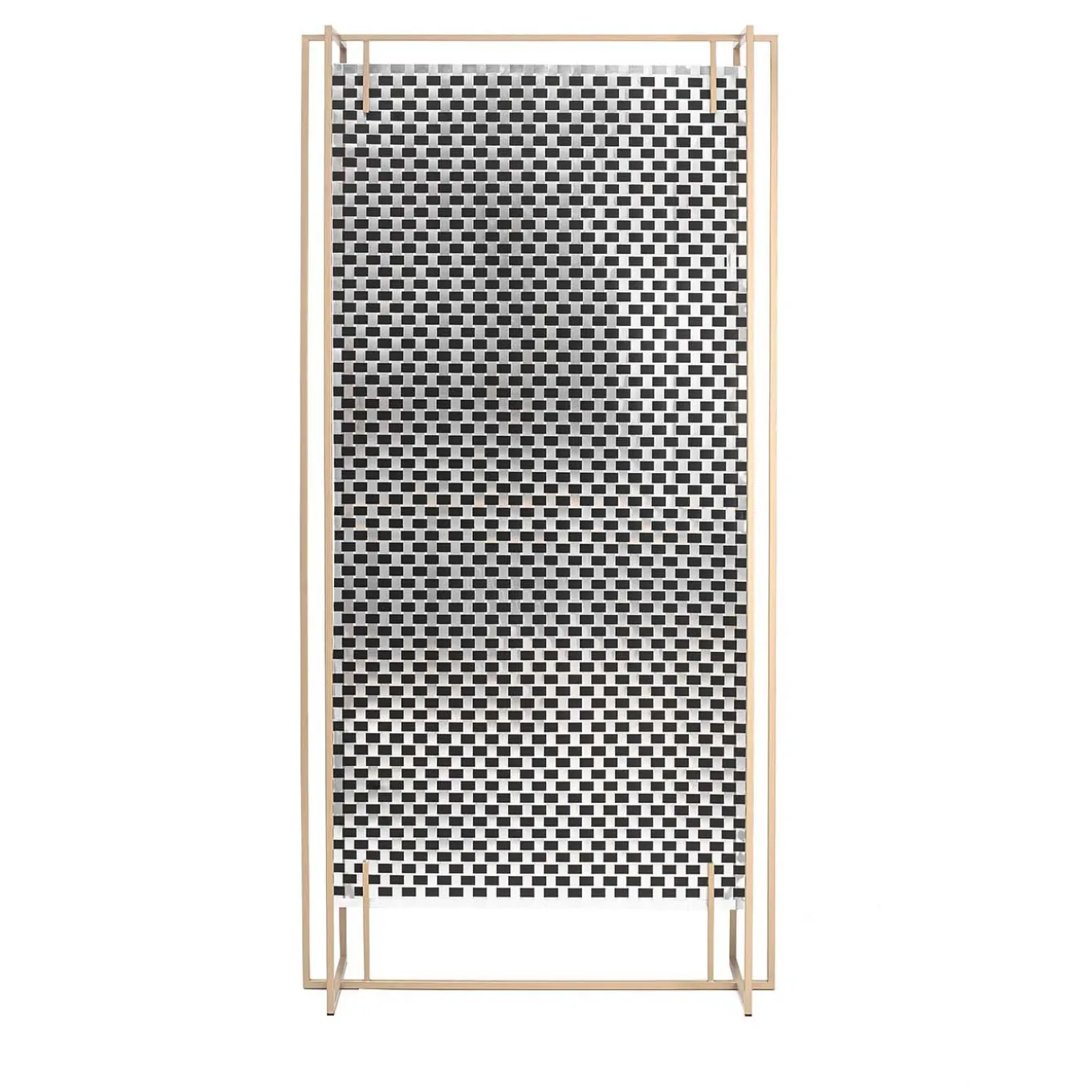 Questo sofisticato pannello da pavimento è caratterizzato da un’elegante e sottile cornice color oro e da un’elegante tela Op-Art degli anni ’60. Altamente versatile, questo stile a doppio uso può essere utilizzato come divisorio per ambienti o come sfondo decorativo se posizionato contro una parete. Il suo corpo intrecciato comprende fogli di alluminio nero e naturale recuperati durante la produzione di rifiuti industriali.
