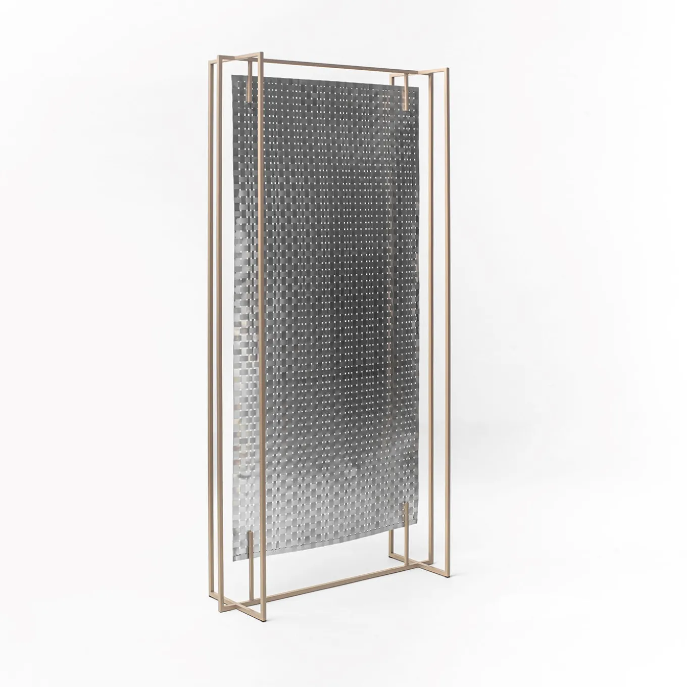 Questo pannello da pavimento a doppia funzione può essere collocato al centro di uno spazio come divisorio, ma anche appoggiato alla parete come sfondo decorativo. La tela intrecciata a mano comprende un foglio di alluminio che conferisce a un lato una lucentezza riflettente, mentre l’altro ha una finitura opaca in oro champagne. Una sottile cornice in ferro color oro completa il look.