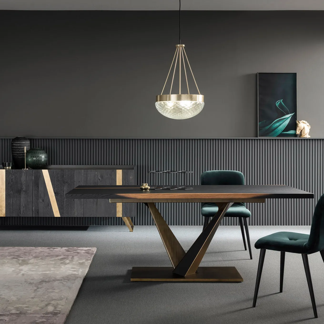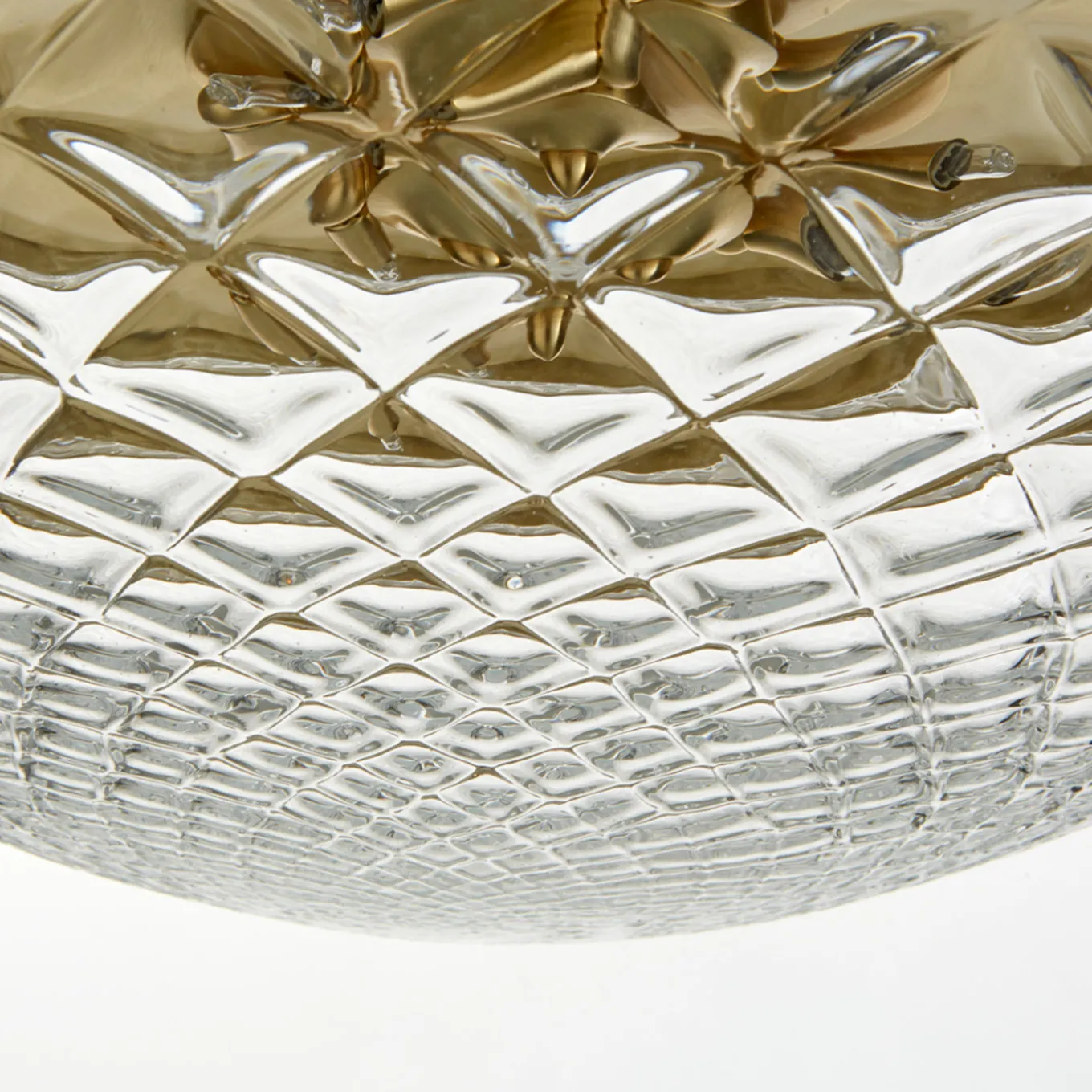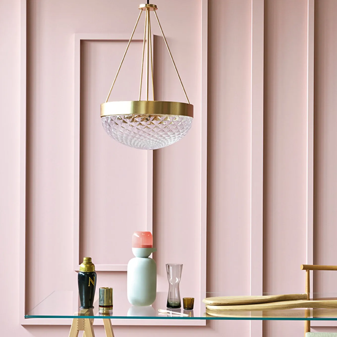 Adatto come lampada da tavolo o a sospensione, questo pezzo accattivante di Matteo Zorzenoni sviluppa il design del paralume di una plafoniera tradizionale e lo reinterpreta in una chiave accattivante e contemporanea. Il paralume, che ospita tre lampadine, è in vetro di Murano soffiato a bocca con una raffinata texture romboidale ed è completato da una struttura in metallo con finitura in ottone satinato. È disponibile anche una finitura nera opaca. Su richiesta, sono disponibili le certificazioni per il settore contract e commerciale.