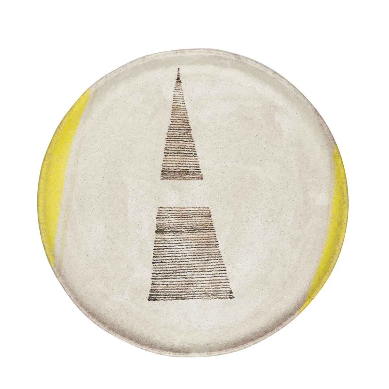 Questo elegante piatto in ceramica è stato lavorato a mano e lo smalto dei suoi colori è stato smaltato con tecniche antiche. Il bianco sporco dello sfondo è ravvivato da tocchi di giallo vivo ai lati, mentre al centro si trova un decoro geometrico ottenuto con piccole strisce parallele di colore marrone. Questo piatto unico può essere utilizzato come decorazione moderna o per illuminare la tavola di tutti i giorni. Disponibile anche nella versione da 18 cm.