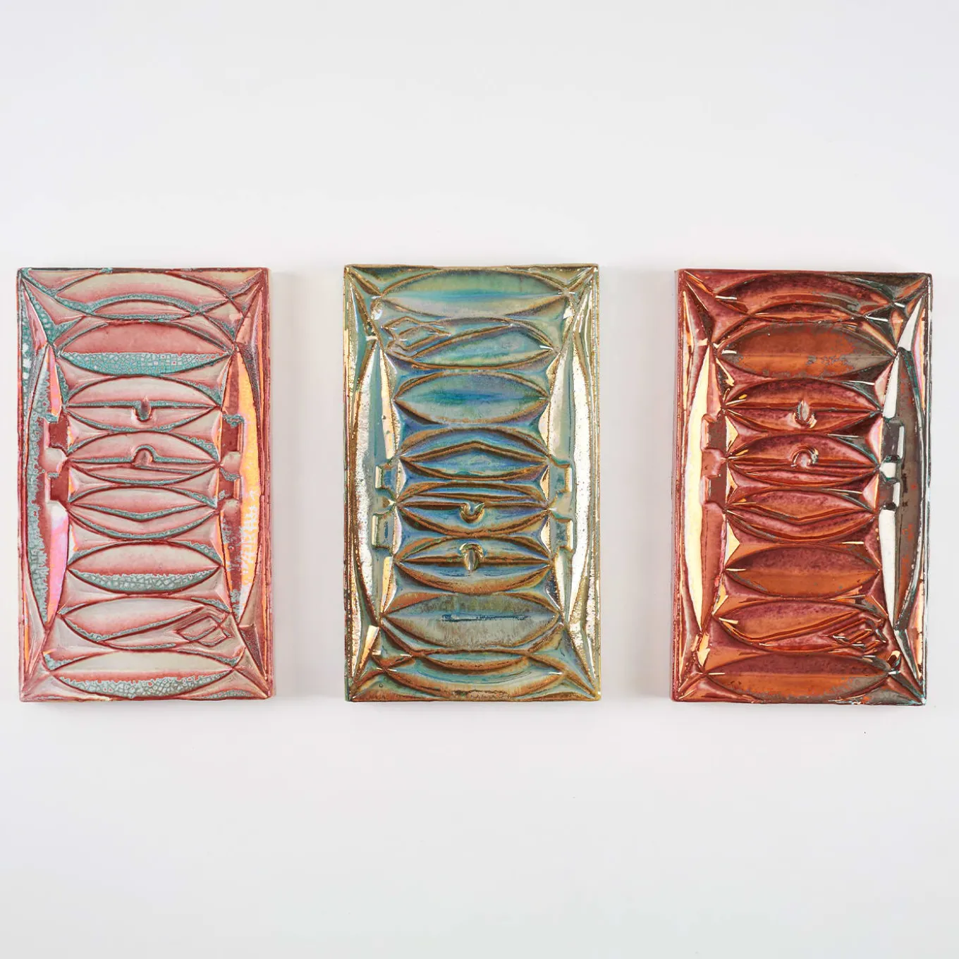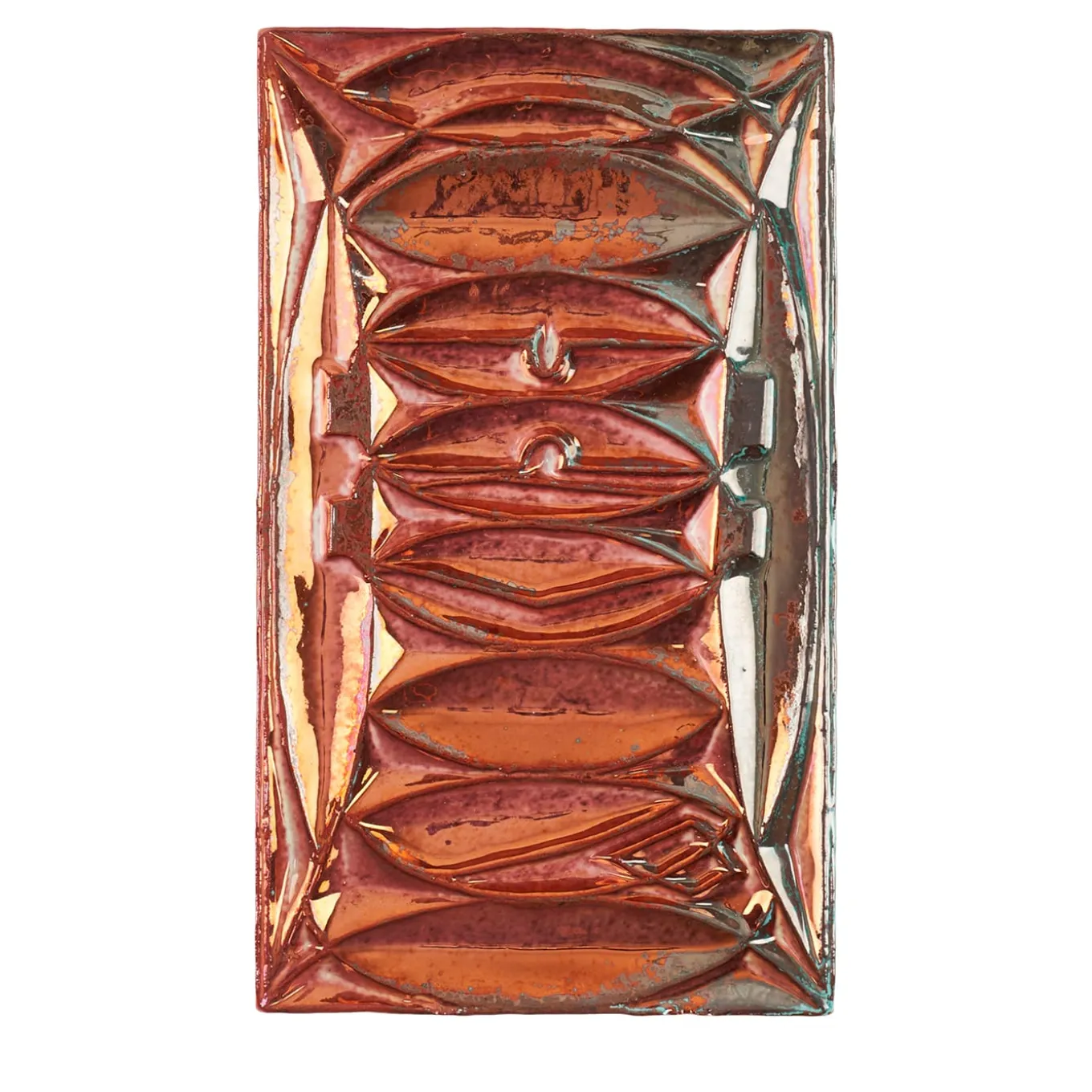 Un intrigante motivo a rilievo rivela immediatamente il carattere decorativo che contraddistingue questa piastrella rettangolare in pregiata maiolica. Ispirata agli stampi di Leandro Lega e disegnata dall’architetto Marco Scarpa, si distingue per il trionfo di sfumature cangianti ottenute dalla stratificazione di ossidi di rame e lustri verdi, effetto ottenuto durante la speciale fase di seconda cottura in riduzione. Dettagli imprevedibili e irripetibili rendono ogni piastrella unica.