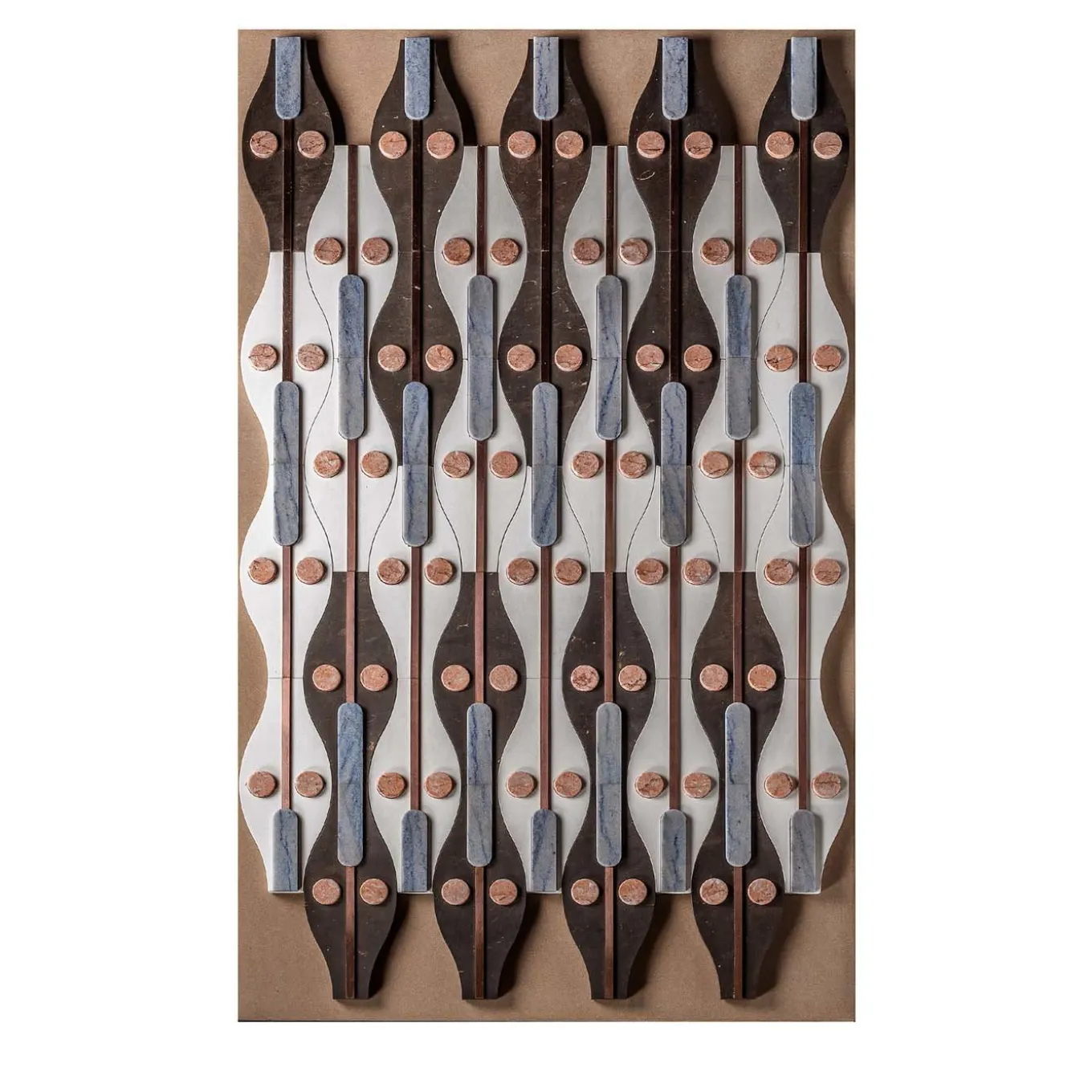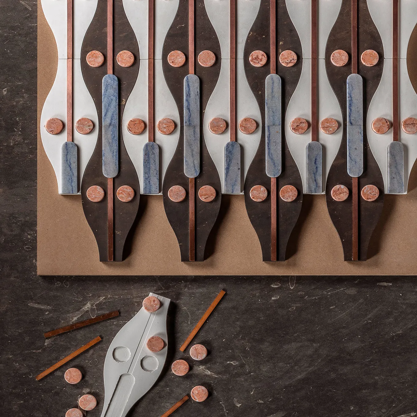 Reinterpretando i mosaici sacri bizantini, queste raffinate tessere della Collezione Bisanzio sono realizzate in Pietra Fenice e Bianco Fenice con finitura levigata, arricchite da cerchi in marmo rosa lucido, rettangoli in marmo macauba azul lucido e strisce di rame con finitura satinata. Il nome Hagia si traduce in “santo” e celebra l’antica raffinatezza. Ogni singola piastrella misura 30x12x2 cm e il pezzo può essere personalizzato nelle dimensioni su richiesta.