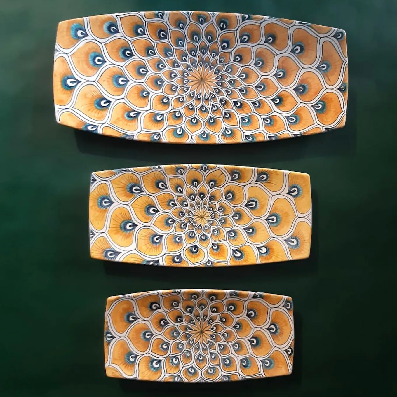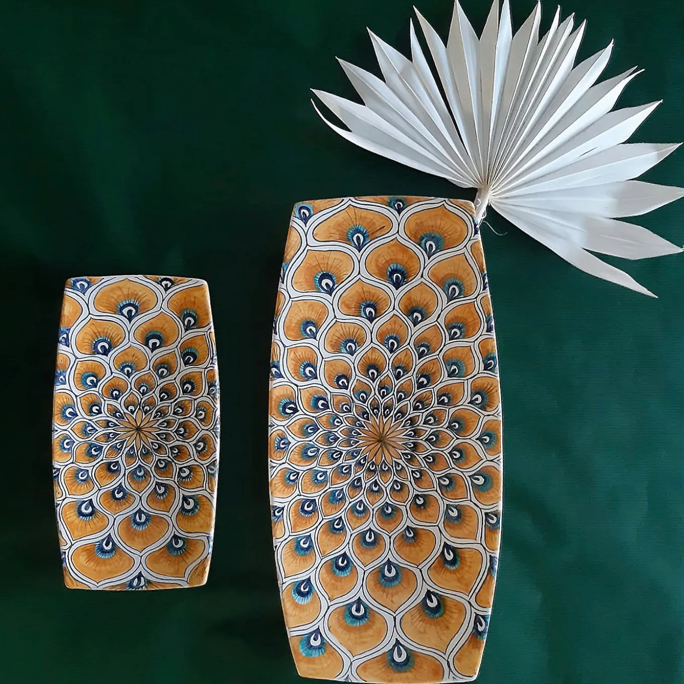 Questa variante piccola del piatto allungato in maiolica della collezione Piuma di pavone giallo è una soluzione sofisticata da esporre con i gemelli per allestire una tavola allegra per cene o aperitivi in stile sushi o izakaya. La sua forma rettangolare con lati convessi sembra espandere il motivo radiale delle piume di pavone che adornano la superficie, minuziosamente dipinta a mano dalla maestra ceramista Maria Rita Nicolini. Disponibile anche in due varianti più grandi.