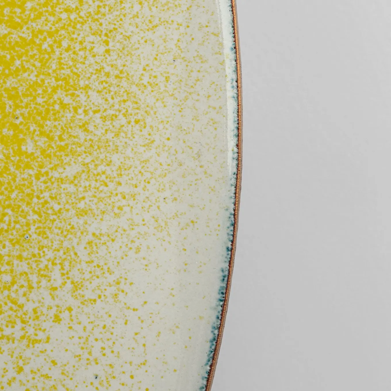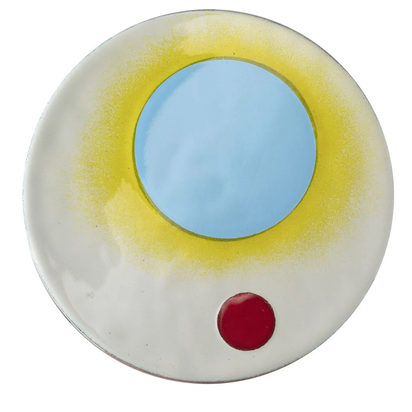 Collezione di piatti decorativi realizzati con la tecnica dello smalto a fuoco su rame. I colori e i motivi derivano da una visita al Guggenheim Museum di New York, mentre la tecnica è un omaggio al design italiano degli anni Cinquanta, Sessanta e Settanta. Il retro è smaltato e rivestito in pelle marrone scuro cucita a mano.