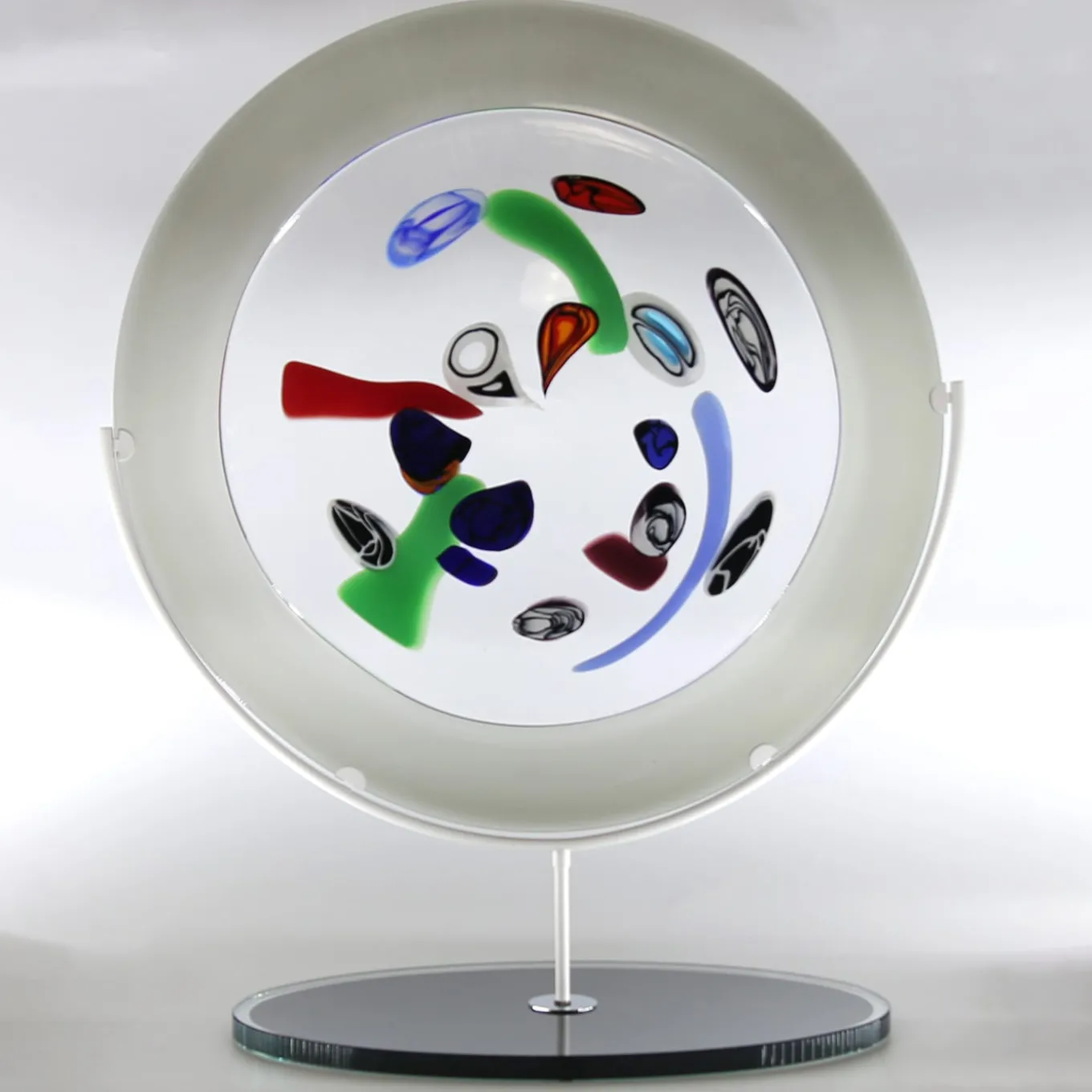 Questo splendido piatto decorativo dal design moderno è completamente realizzato a mano a Murano dai maestri vetrai di Venezia. Questo piatto decorativo è il complemento ideale per l’arredamento di una casa, di un ufficio o di uno studio. Viene consegnato con il piedistallo e un certificato di origine.