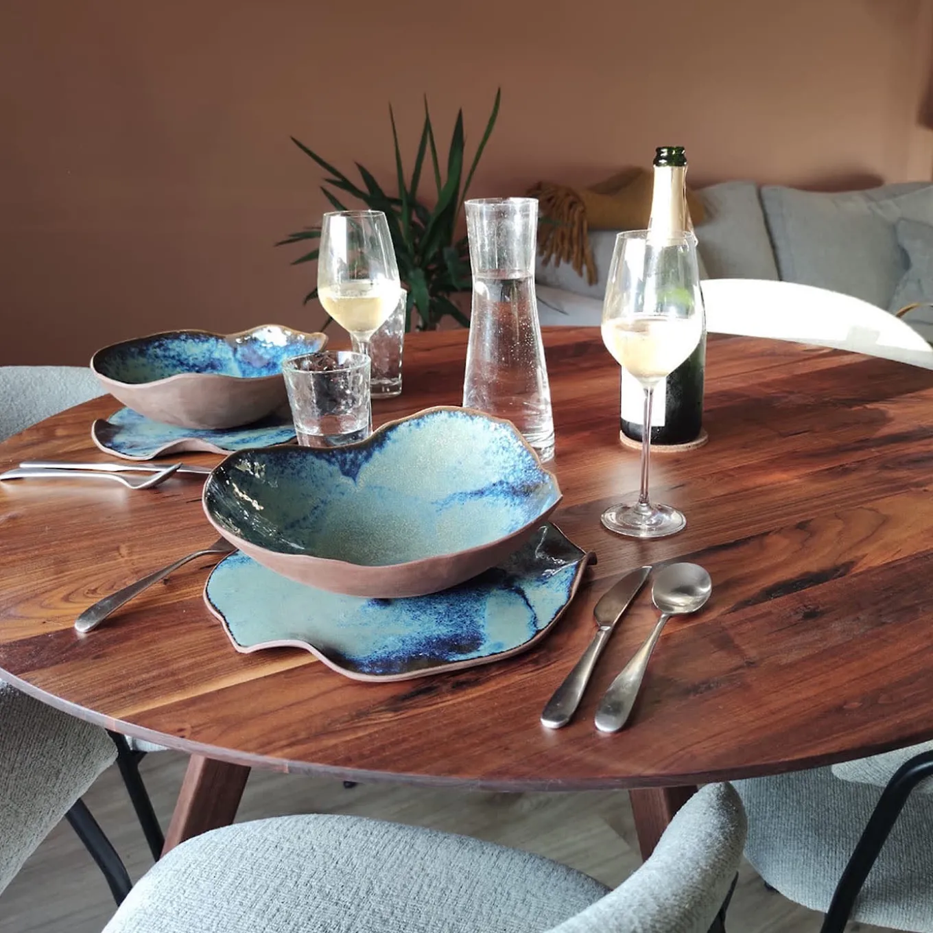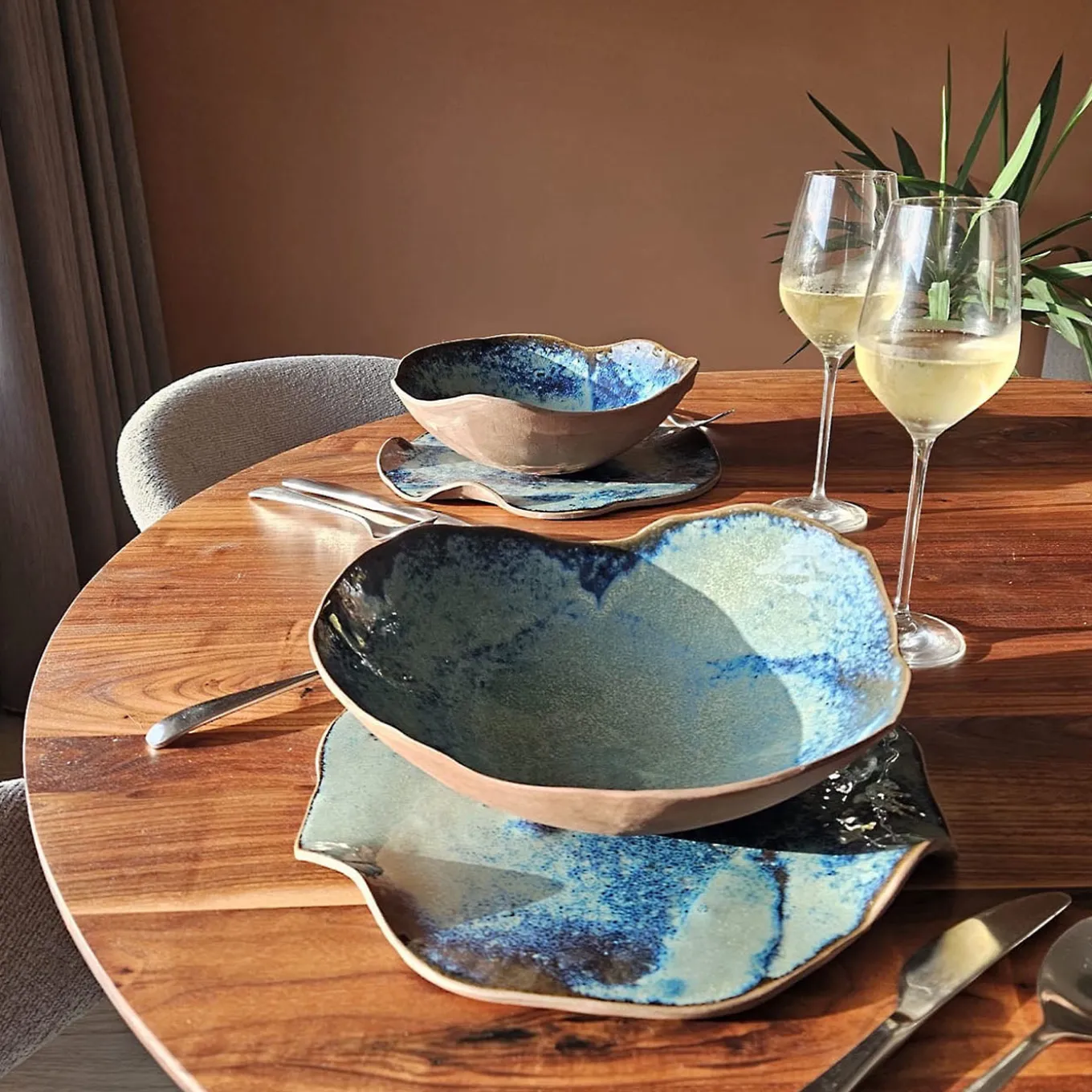 La bellezza della collezione Cosmosis risiede nel forte contrasto tra la superficie in terracotta rosso scuro, non smaltata, e il blu lucido, profondo e punteggiato dello smalto interno, che ricorda una cascata di stelle in una notte d’estate. Questo aspetto darà un tocco di stravaganza poetica alla vostra tavola. I piccoli movimenti a onda del bordo conferiscono un aspetto morbido e sensuale. Ogni pezzo è unico e, a causa della lavorazione a mano, possono verificarsi lievi variazioni.