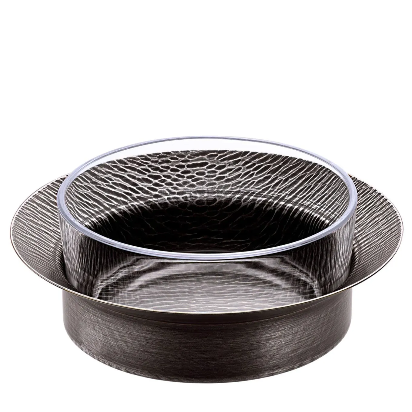 La ciotola Iside Small Bronze coniuga elegantemente design e praticità, diventando un complemento raffinato per qualsiasi esperienza culinaria. Realizzata in bronzo bianco brunito, la ciotola presenta un esterno meticolosamente martellato che crea un accattivante gioco di luci e ombre, esaltando il suo fascino visivo. L’interno è progettato per ospitare un’oppetta di vetro rimovibile, offrendo una soluzione ideale per la presentazione elegante di insalate, antipasti o salse. Parte della prestigiosa Iside Collection, questa ciotola incarna una fusione perfetta di tradizione e modernità, arricchendo ogni mise en place con un tocco di esclusività. L’armoniosa combinazione di metallo lavorato a mano e vetro trasparente offre un contrasto raffinato che promette di trasformare ogni portata in una delizia sensoriale.