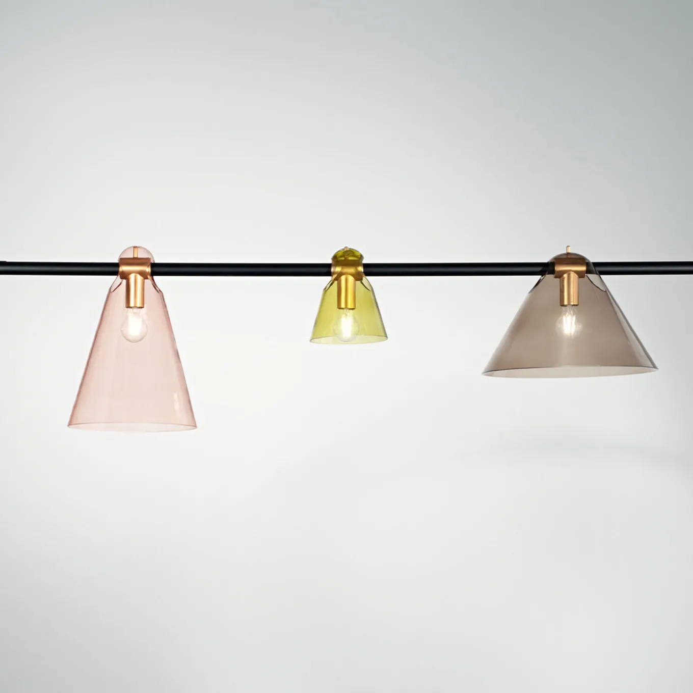 Un pezzo della “Luna Collection”, creata dallo studio AnalogLab per Aggio Light. La collezione è il risultato della combinazione tra il design minimale e i materiali e le capacità dell’artigianato italiano. È sviluppata in una serie di finiture e dimensioni. È un sistema innovativo interamente prodotto in Italia. Un binario nero opaco con accenti in ottone spazzolato, 3 diffusori conici in vetro soffiato nei colori rosa polveroso, giallo-verde e grigio fumo. Personalizzabile su richiesta.