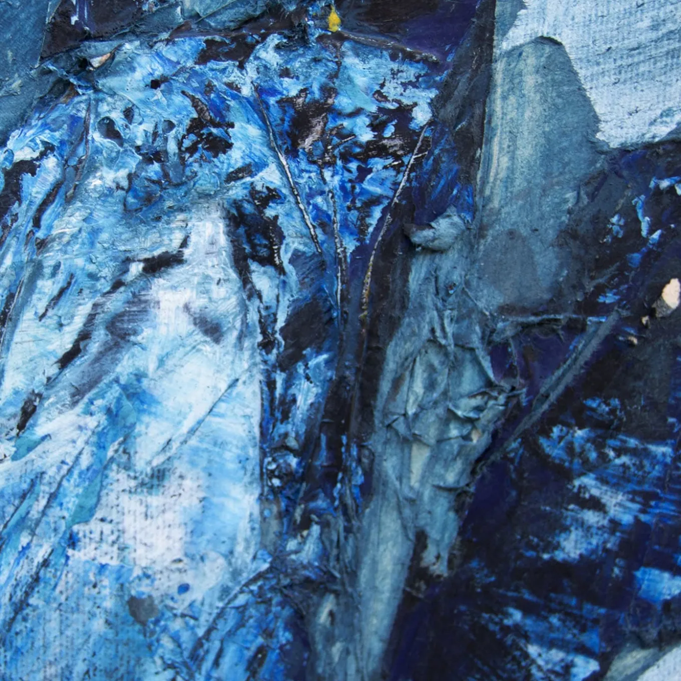 Sfumature di pittura acrilica blu e inchiostro nero illuminate da dinamiche pennellate di luce evocano le atmosfere notturne – con le sue luci sottili e le variabili meteorologiche – che questo dipinto evoca attraverso i suoi tratti astratti. Lo strato di carta velina che ricopre la tela accoglie i colori, conseguentemente schiariti per un poetico impatto cromatico. L’opera viene consegnata senza cornice e viene fornita con un certificato di autenticità.