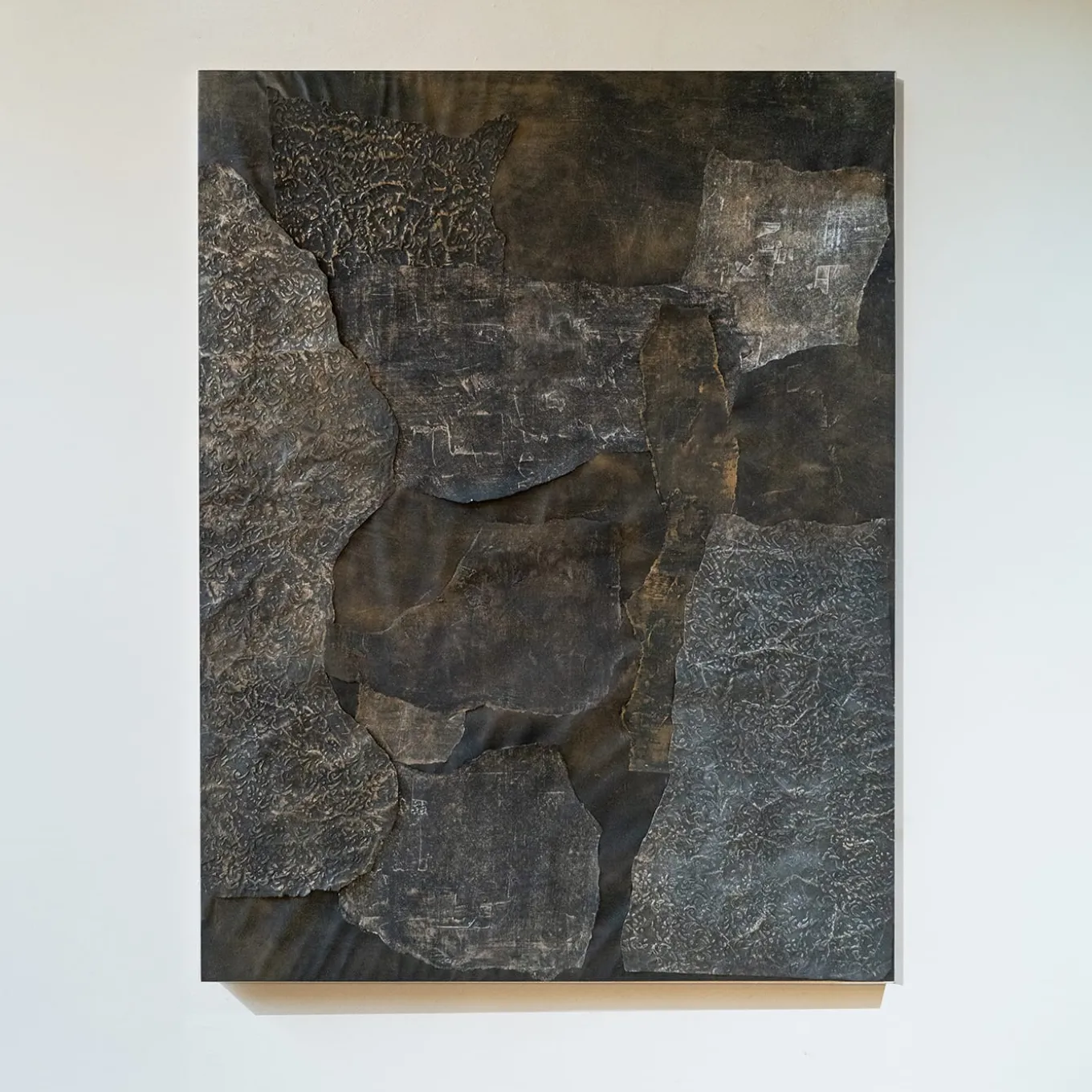 Un’opera suggestiva e misteriosa, fette di carta ritagliate e dipinte con polveri minerali metalliche, stratificate in modo da ricordare il manto erboso e la terra.